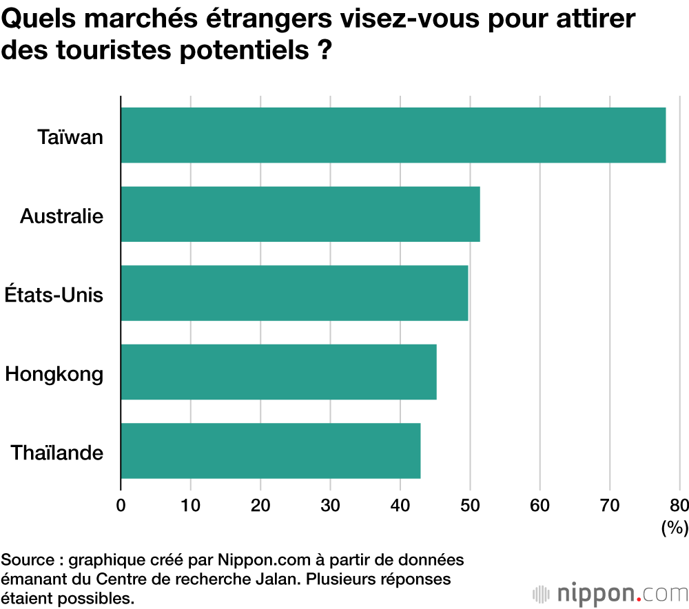 Taïwan est le pays étranger le plus fréquemment visé pour le tourisme entrant, mentionné par 78 % des personnes interrogées. Viennent ensuite l’Australie avec 51,4 % et les États-Unis avec 49,7 %. Comparé aux résultats du sondage mené en 2023, il est à noter que l’Australie est passée devant les États-Unis. L’une des raisons pour lesquelles l’accent a été mis sur les touristes originaires de Taïwan est qu’ils ont tendance à revenir plusieurs fois au Japon et à visiter des endroits en dehors des zones urbaines principales.