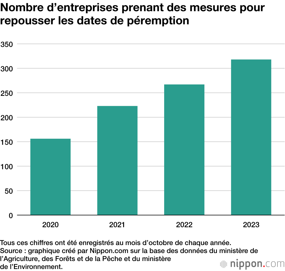 Selon le ministère de l’Agriculture, des Forêts et de la Pêche, un nombre croissant de supermarchés et de supérettes ont choisi d’assouplir les délais de livraison et de repousser les dates de péremption. Dans certains cas, l’étiquetage des dates a été modifié. Avant il était fait mention de l’année du mois et même du jour (par exemple, à consommer avant le 1/1/2025) désormais ne figurent plus que l’année et le mois (à consommer de préférence avant 1/2025). Dans leur lutte contre le gaspillage, les magasins ont aussi changé leur mise en rayon. Désormais, ils mettent en avant (temae-dori) les produits dont la date de péremption est proche pour attirer l’attention de la clientèle et encourager l’achat.