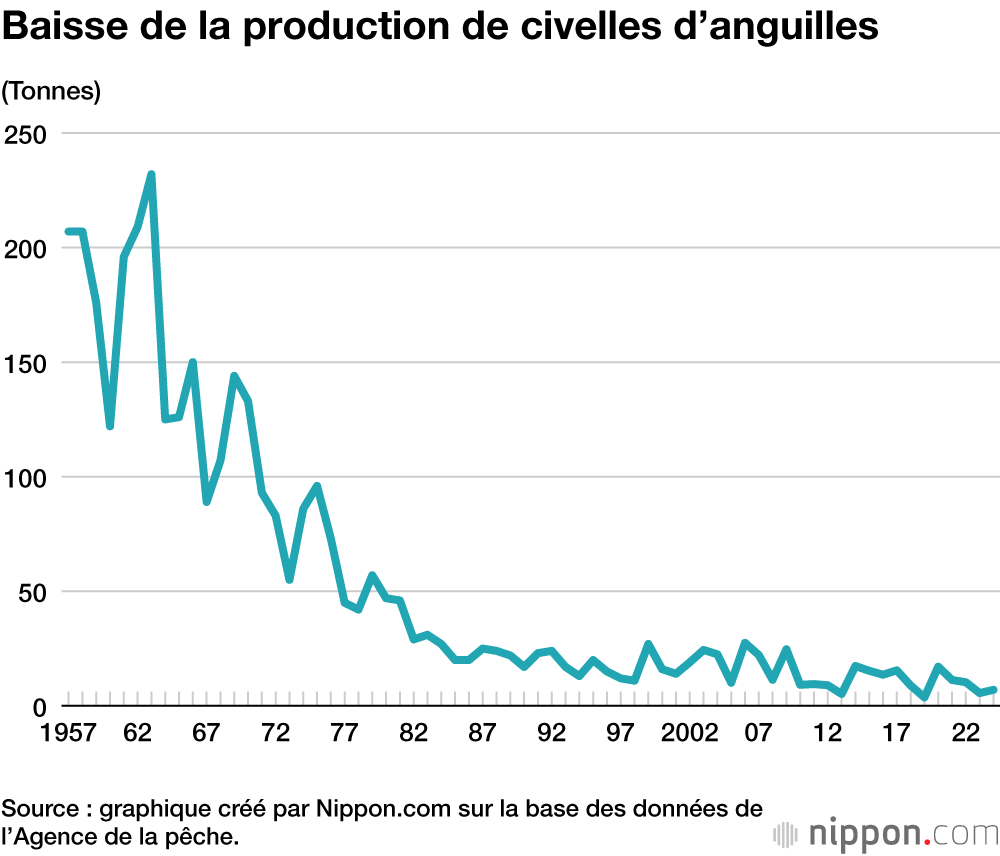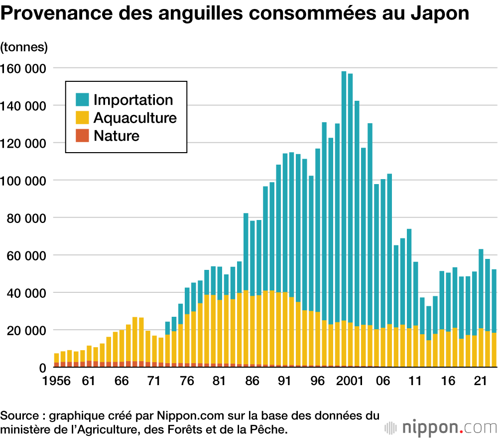 La plupart des anguilles consommées au Japon viennent de civelles prélevées dans le milieu naturel puis élevées dans des fermes aquacoles. Mais la capture de juvéniles dans les eaux territoriales est à son plus bas depuis les années 1980 et les prix sont montés en flèche. Ainsi en 2023, 65 % des anguilles consommées au Japon sont des produits d’importation.