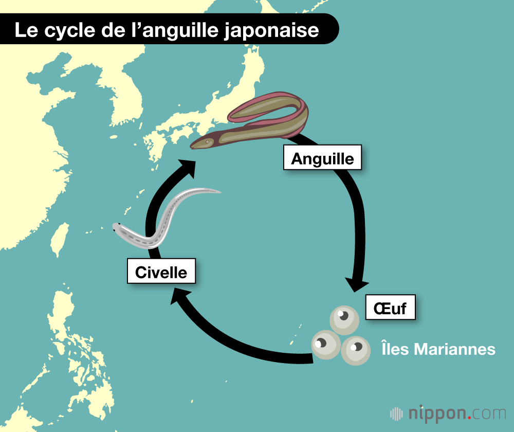 L’alevin d’anguille japonaise mesure de 5 à 6 cm de long et pèse 0,2 gramme. Les anguilles qui vivent dans les rivières migrent vers les îles Mariannes à environ 2 000 km du Japon, pour y pondre leurs œufs. Après éclosion, les leptocéphales se transforment en civelles au fur et à mesure de leur migration vers le nord, pour atteindre finalement les côtes du Japon portés par le courant de Kuroshio. Selon l’Agence de la pêche, l’élevage d’anguilles exigerait la ponction de pas moins de 100 millions de civelles naturelles.