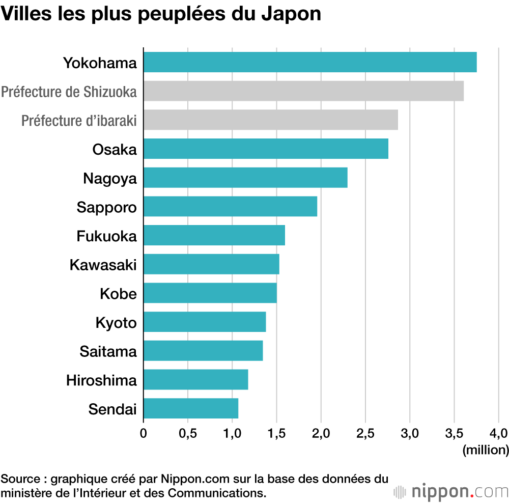 L’étude démographique publiée par le ministère de l’Intérieur et des Communications, établie sur les données du recensement, montre qu’au Japon les trois villes les plus peuplées sont, en date du 1er janvier 2024, Yokohama (3 752 969 habitants), Osaka (2 757 642) et Nagoya (2 297 745). (D’un point de vue administratif, la mégalopole de Tokyo est traitée à part, elle a le rang de préfecture et non de commune). Il y a plus d’habitants dans la ville de Yokohama que dans la préfecture de Shizuoka (3 606 469) et il y a presque autant d’habitants à Osaka que dans la préfecture d’Ibaraki (2 865 690). Onze villes comptent plus d’un million d’habitants.