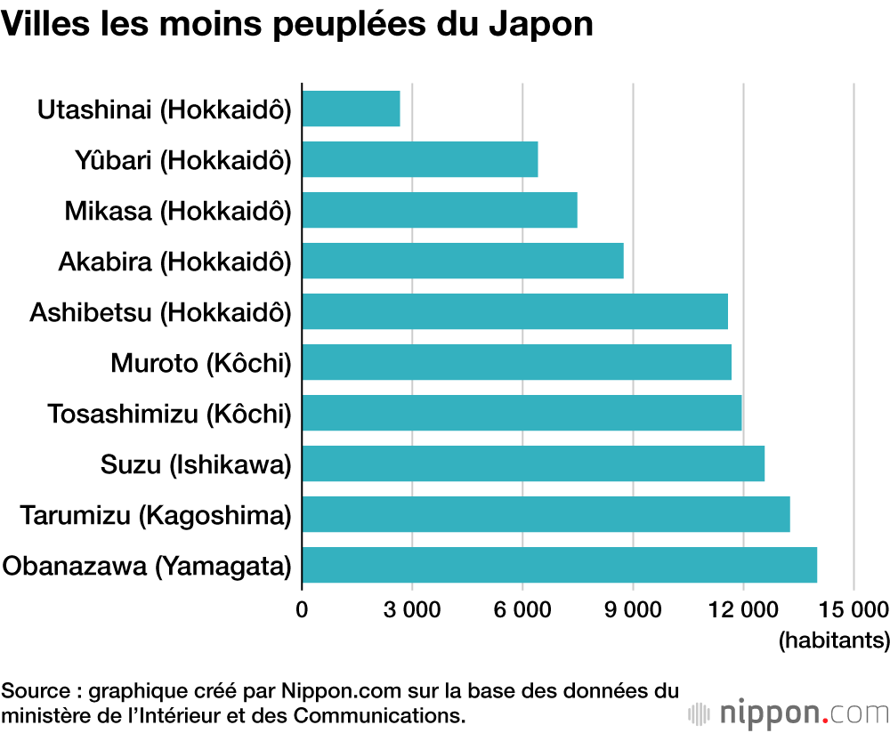 D’un autre côté, 37 communes comptent désormais moins de 20 000 habitants alors qu’elles n’étaient que 33 en 2023. En effet, Shimoda (préf. Shizuoka), Susaki (préf. Kôchi), Hakui (préf. Ishikawa) et Furano (préf. Hokkaidô) sont toutes passées sous le seuil en 2024. Avec seulement 2 668 habitants, Utashinai (préf. Hokkaidô) reste la ville la moins peuplée (1 406 fois moins d’habitants que Yokohama). Les cinq communes les moins peuplées sont toutes situées à Hokkaidô.