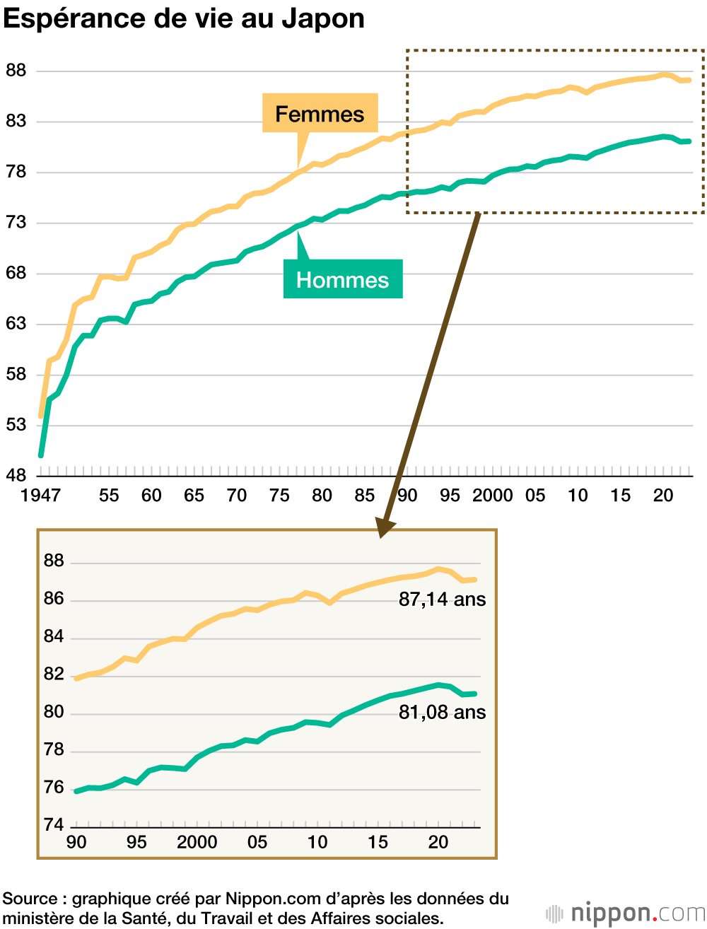 Pour les enfants nés au Japon en 2021, 51 % des filles et 26 % des garçons devraient pouvoir vivre jusqu’à 90 ans. Et pour ceux qui dépasseront les 95 ans, le pourcentage est de 25,5 % et de 9,2 % respectivement.