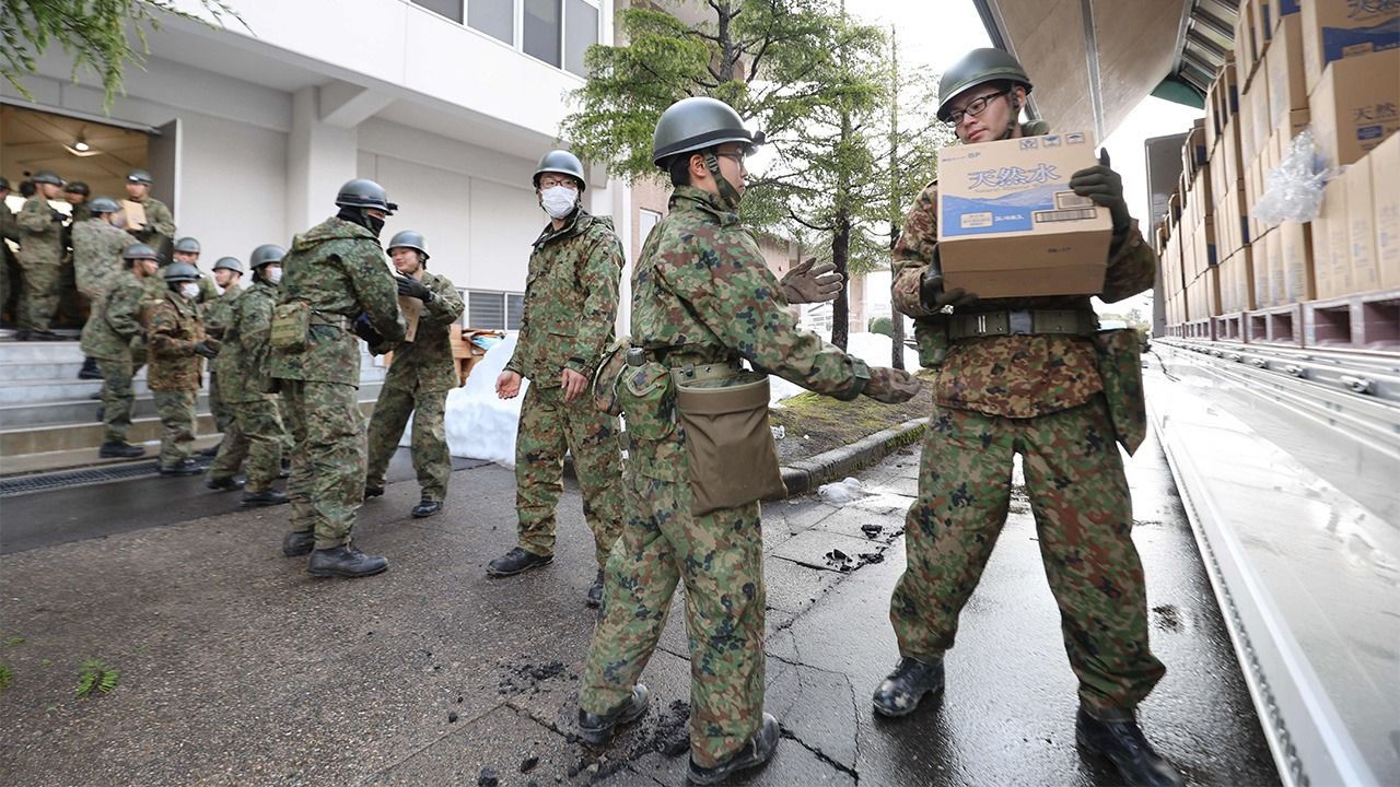 (Photo de titre : les Forces japonaises d’autodéfense envoyées pour participer aux secours à la suite du tremblement de terre de la péninsule de Noto livrent de l’eau au gymnase de Suzu, dans la préfecture d’Ishikawa, le 6 janvier 2024. © Jiji)