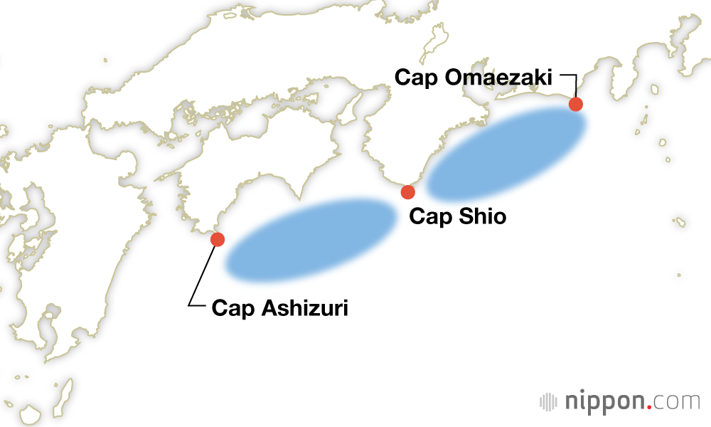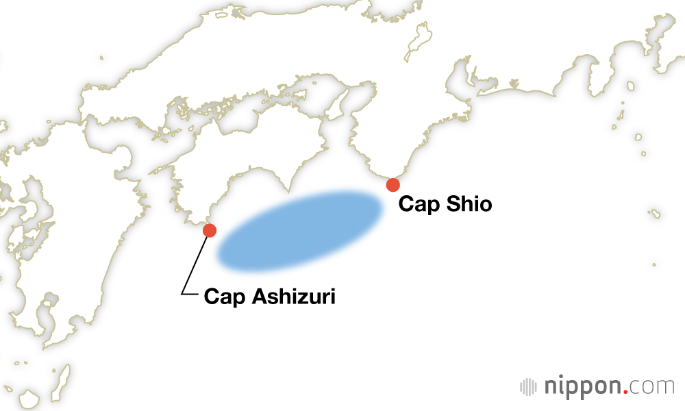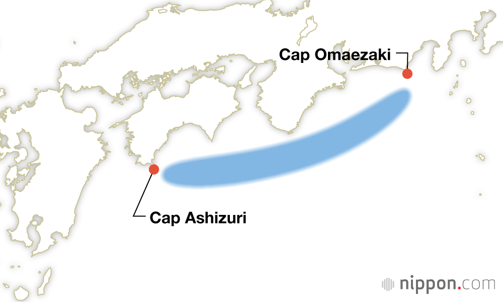 Zone épicentrale : du large du cap Ashizuri à Shikoku (ville de Tosashimizu, préfecture de Kôchi) au large du cap Shio (ville de Kushimoto, préfecture de Wakayama).