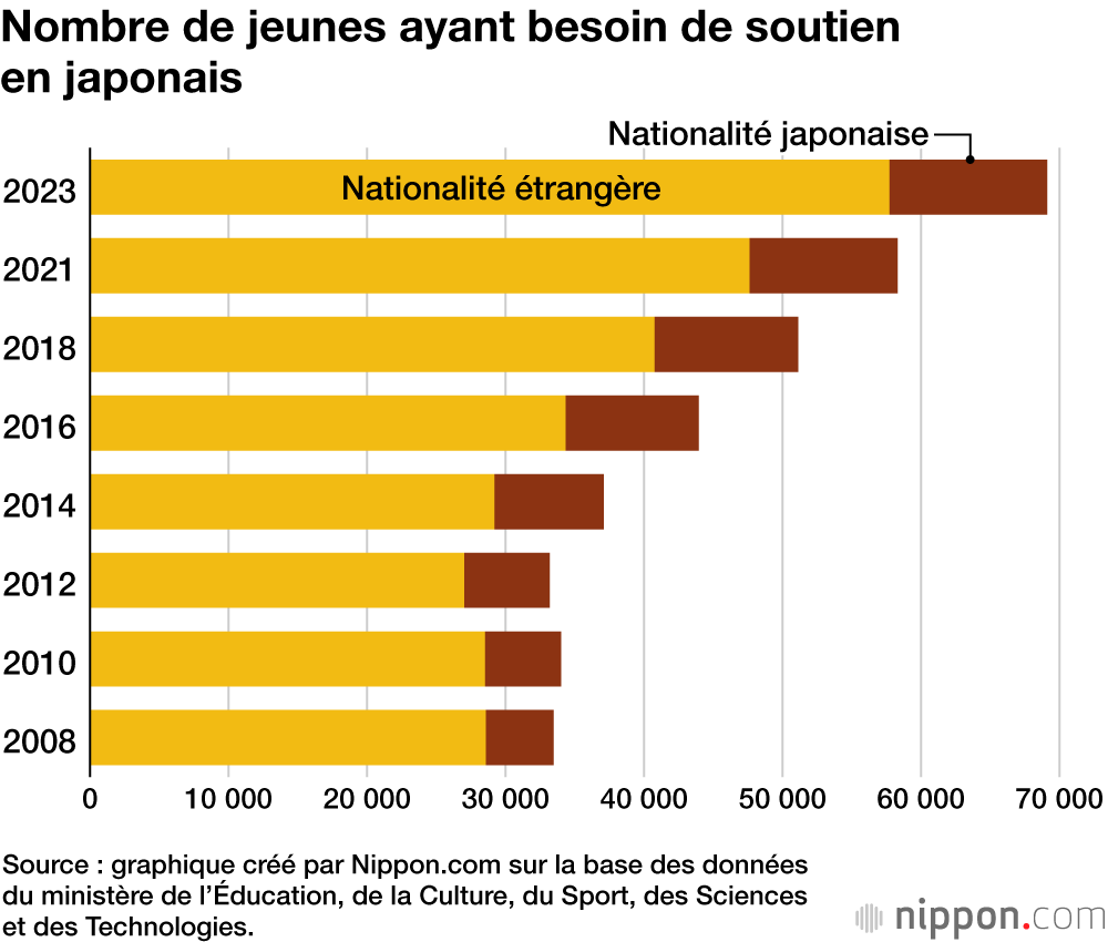 En 2023, 69 123 jeunes scolarisés au Japon en primaire, au collège et au lycée ont eu besoin de soutien en japonais, soit parce qu’ils étaient nés à l’étranger, soit que leurs parents n’étaient pas de langue maternelle japonaise. Ces chiffres sont tirés de l’enquête menée tous les deux ans par le ministère de l’Éducation, de la Culture, du Sport, des Sciences et des Technologies (MEXT). Ces jeunes sont de plus en plus nombreux, 18,6 % de plus qu’en 2021 (58 307 jeunes) et plus du double qu’en 2008 (33 470 jeunes).