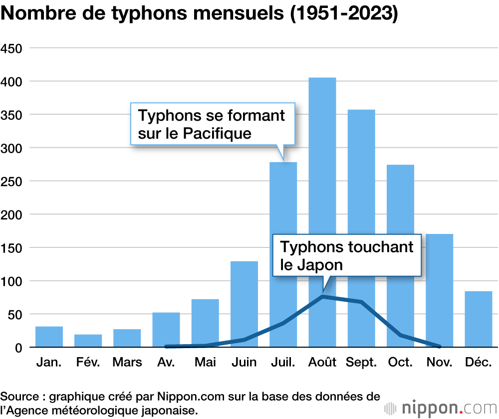 Le nombre peut varier, mais chaque année, il se forme environ 26 typhons (moyenne pour la période allant de 1951 à 2023), dont 3 touchent le Japon.