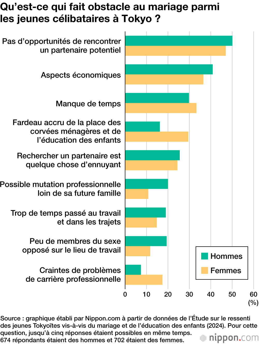 La Chambre du Commerce et de l’Industrie de Tokyo a mené sa première étude sur le ressenti des jeunes à Tokyo vis-à-vis du mariage et des enfants. 78,7 % des célibataires de la capitale ont répondu qu’ils pensaient se marier un jour. Cependant, parmi ce qui les freine à accomplir leur objectif, 50,1 % des hommes et 47 % des femmes célibataires citent le manque d’opportunités de rencontrer un partenaire potentiel. Ces chiffres sont plus élevés que ceux qui ont cité des « aspects économiques » comme obstacles (respectivement 40,9 % pour les hommes célibataires et les 36,5 % pour les femmes).