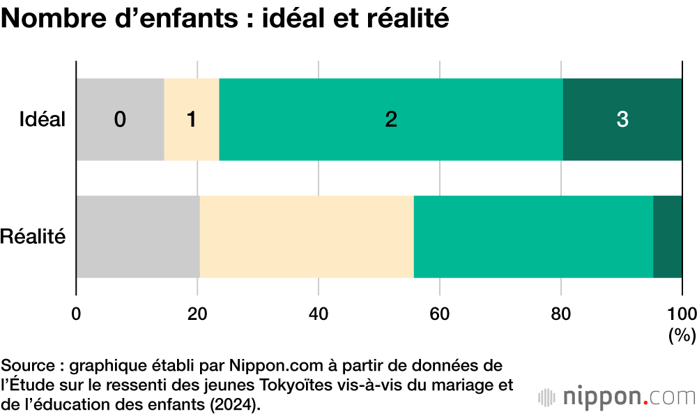 Le nombre d’enfants mentionnés par les personnes interrogées, idéal et réaliste, avait tendance à augmenter selon la tranche de revenu. Parmi les personnes ayant un revenu annuel d’environ 3 millions de yens (18 000 euros), 24,6 % ont confié que « zéro » était le nombre idéal.