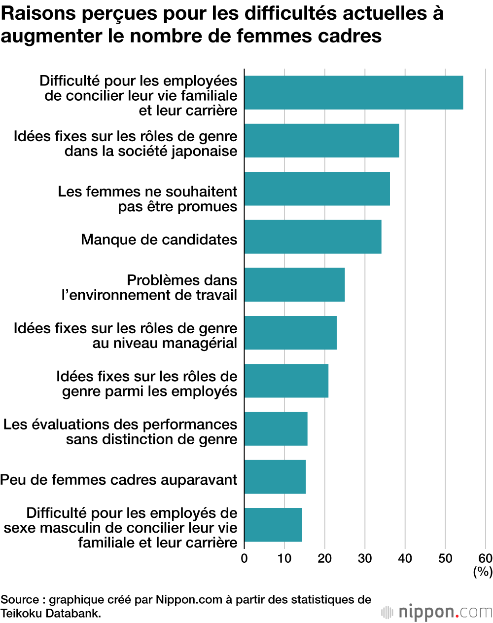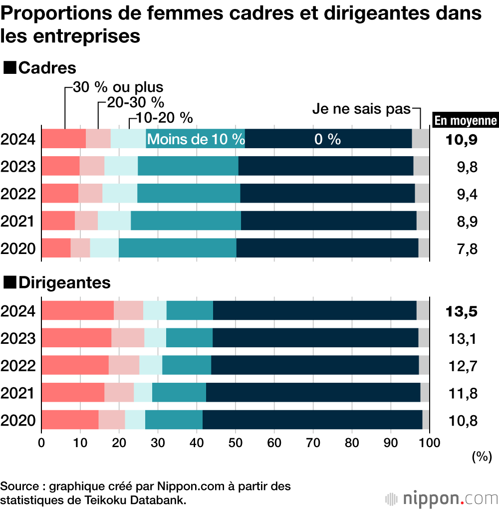 Une enquête menée en juillet 2024 par Teikoku Databank auprès de 27 191 entreprises à travers le Japon révèle que la part des cadres de sexe féminin a augmenté de 1,1 point de pourcentage, atteignant 10,9 %. C’est la première fois depuis le lancement de ce sondage en 2013 que ce chiffre dépasse les 10 %. Cependant, les entreprises où « tous les cadres sont des hommes » constituent toujours le groupe le plus important (43 %), et l’objectif gouvernemental d’atteindre au moins 30 % de femmes dans les postes de direction est donc encore bien loin d’être atteint. Par rapport aux normes mondiales, le Japon accuse un retard significatif, se classant 118e sur 146 pays dans le rapport 2024 du Forum économique mondial sur l’écart entre les sexes.