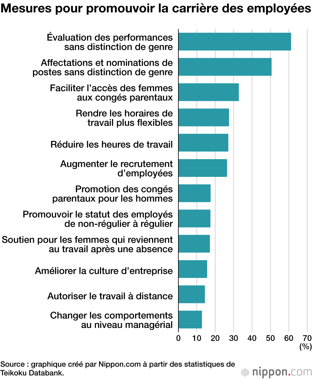 La principale mesure adoptée par les entreprises pour favoriser l’avancement des femmes employées était « l’évaluation des performances sans distinction de genre », mentionnée par 61,2 % des entreprises sondées, suivie par « les affectations et nominations de postes sans distinction de genre » à 50,6 %, et « faciliter l’accès des femmes aux congés parentaux » à 32,8 %. Seulement une entreprise sur quatre environ a mis en œuvre des politiques visant à « rendre les horaires de travail plus flexibles » ou à « réduire les heures de travail », avec des taux respectifs de 27,5 % et 27,1 %. Par ailleurs, 17,5 % des entreprises travaillent sur la « promotion des congés parentaux pour les hommes », une initiative également soutenue par le gouvernement, enregistrant une hausse de 1,8 point par rapport à l’année précédente.