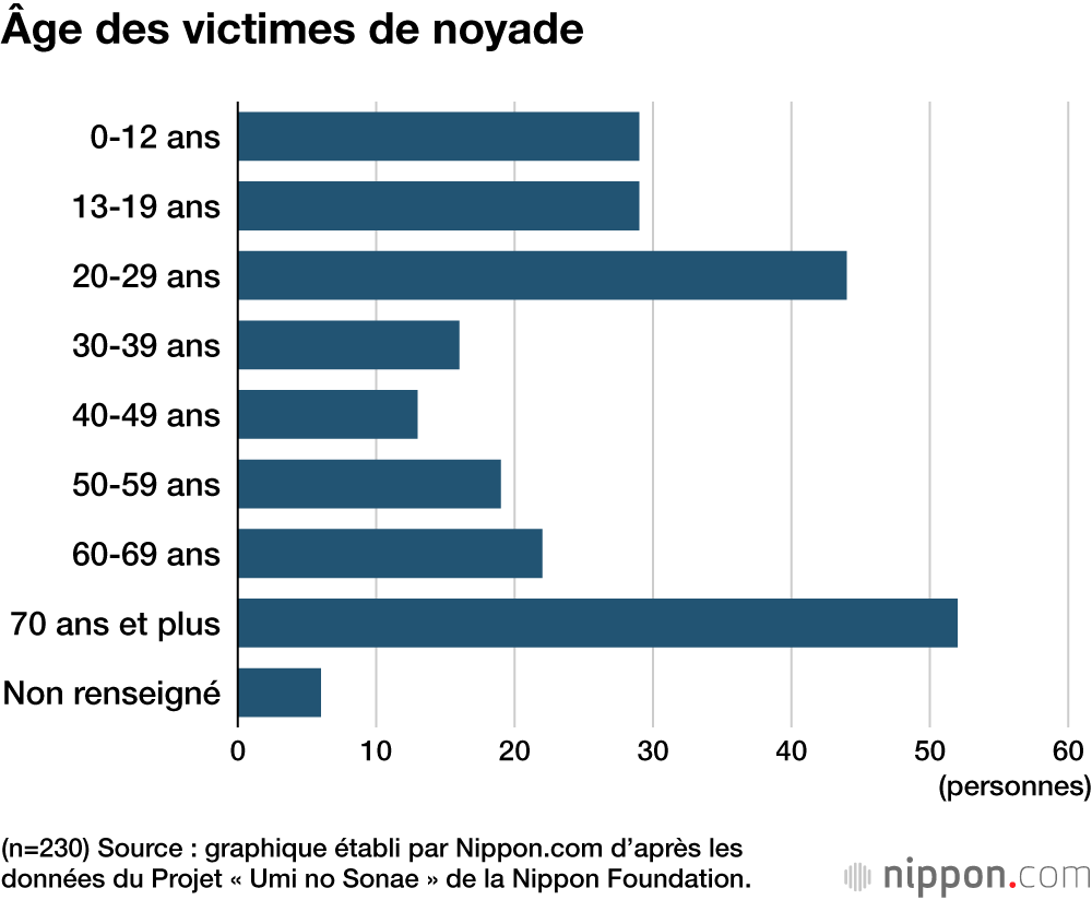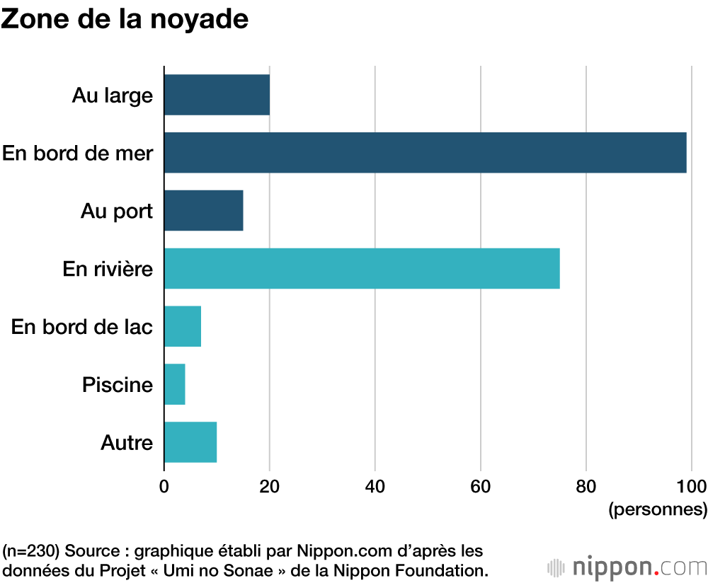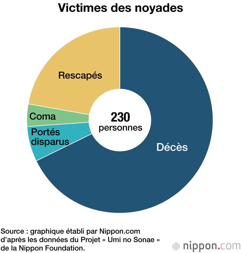Dans le cadre de son projet « Umi no Sonae », la Nippon Foundation s’est lancée dans une veille de différents médias : journaux (nationaux, régionaux ou numériques), télévision et internet, ce qui lui a permis de compiler et d’analyser 2 548 articles de presse portant sur les noyades s’étant produites au Japon entre le 1er juillet et le 25 août 2024. Sur la période, elle a recensé 230 victimes dans 212 affaires de noyade.