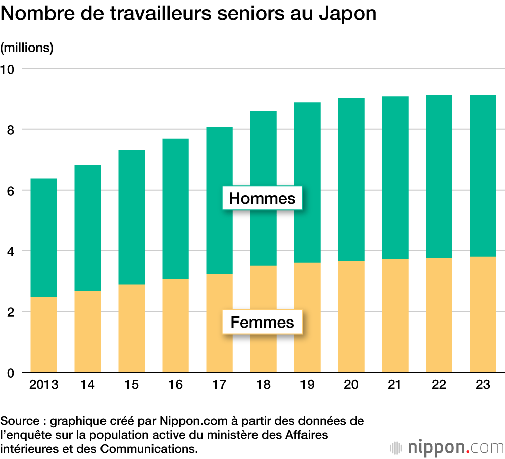 Le vieillissement de la population japonaise se reflète dans sa force de travail. En 2023, on comptait plus de 9,1 millions de travailleurs âgés de 65 ans et plus, ce qui excède le total de l’année précédente pour la 20e année consécutive. Par industrie, la vente en gros et en détail comptaient le plus grand nombre d’employés (1,3 million) suivis de la santé et des aides sociales (1,1 million) et de l’industrie des services (1 million). On compte 2,4 fois plus de travailleurs âgés dans la santé et les aides sociales qu’il y a 10 ans, avec une augmentation notable pour les soins infirmiers. Le ratio de seniors au sein du nombre total des travailleurs âgés de 15 ans et plus était de 13,5 %, ce qui signifie qu’un employé sur sept a 65 ans ou plus au Japon.