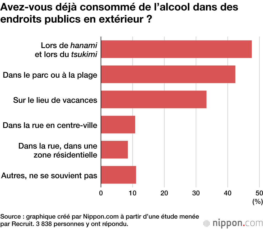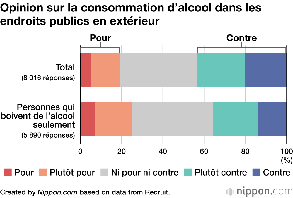 Au début du mois d’août, l’institut de recherche Hot Pepper Gourmet, de la société Recruit, a mené une étude sur la consommation d’alcool en extérieur dans des endroits publics, tels que des parcs ou dans la rue. Sur 8 016 personnes qui ont répondu à la question « Avez-vous déjà bu de l’alcool en extérieur dans des endroits publics ? », 47,9 % ont répondu par l’affirmative et 25,6 % par la négative.
