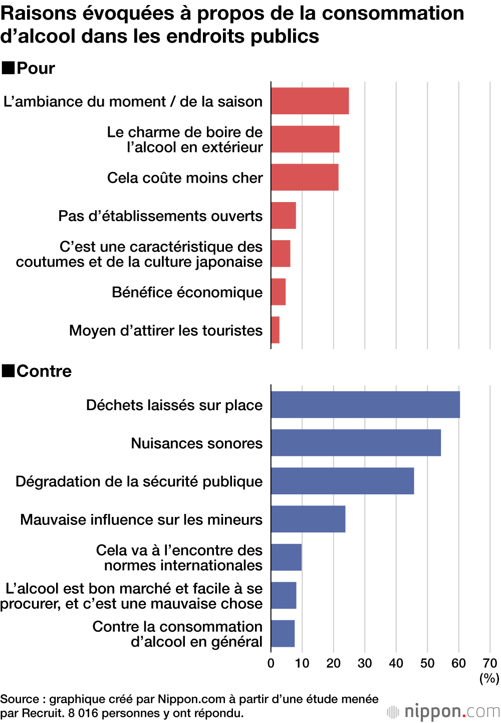 Les personnes qui se disent « pour » la consommation d’alcool dans les endroits publics en extérieur citent notamment « l’ambiance de la saison », ainsi que le fait qu’il est « agréable de boire de l’alcool en plein air » ou encore le fait que « cela coûte moins cher ». En revanche, les trois principales raisons évoquées contre cette pratique sont « les déchets laissés sur place » (60,4 % des personnes interrogées), « les nuisances sonores » (54,3 %) et « la dégradation de la sécurité publique » (45,7 %) ».