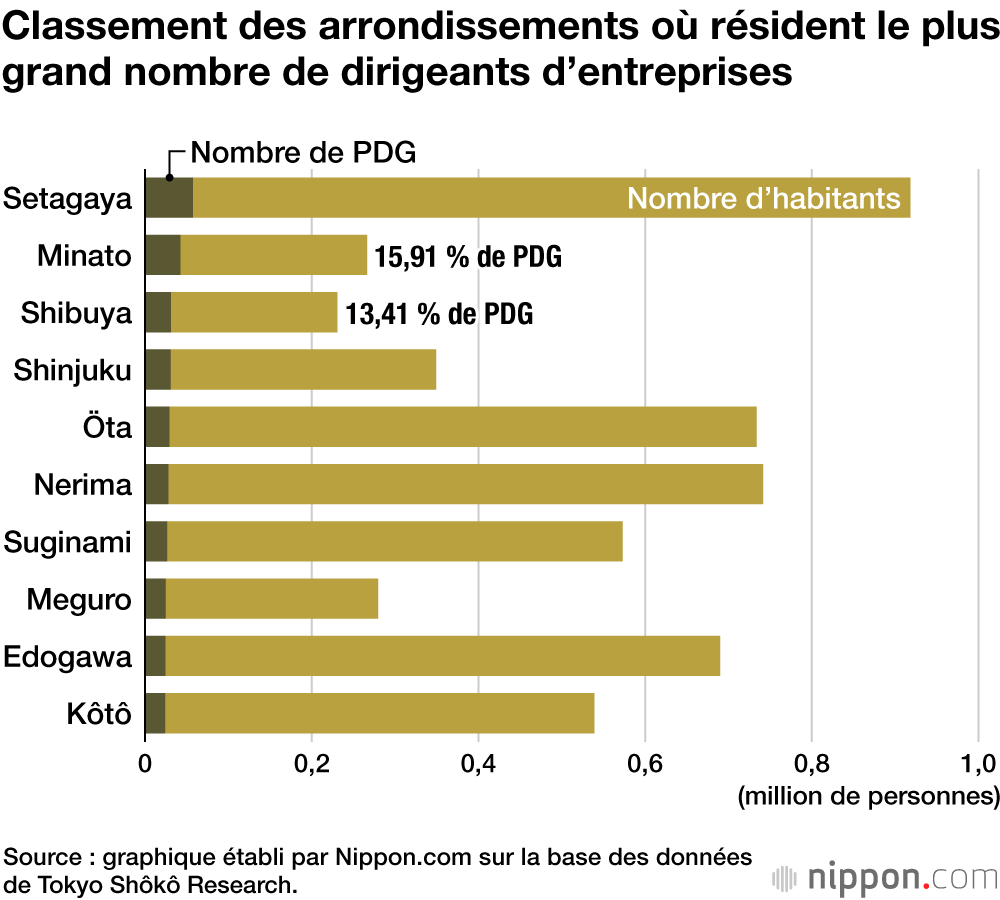 Par ailleurs, en regardant par arrondissement de la capitale, Setagaya est celui comptant le plus de dirigeants (57 734). Cette tranquille zone résidentielle est connue pour ses quartiers de Seijô, Okusawa et Fukasawa.