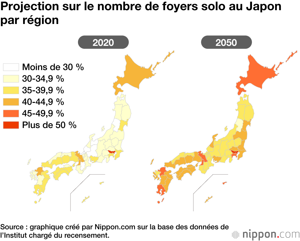 En 2020, 21 151 000 des 55 705 000 foyers japonais étaient des foyers solo (38 %). La barre des 40 % était dépassée dans cinq préfectures : Hokkaidô (40,5 %), Tokyo (50,2 %), Kyoto (41,2 %), Osaka (41,8 %) et Fukuoka (40,7 %).