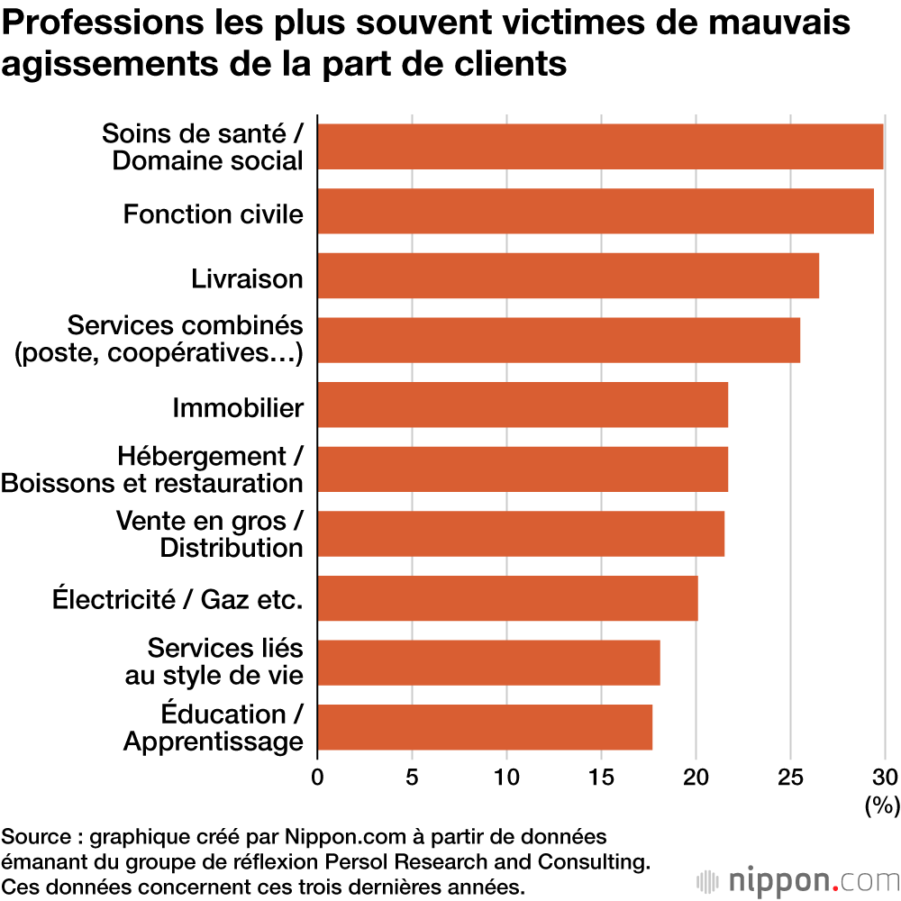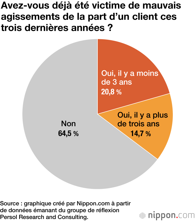 Une enquête menée par le groupe de réflexion Persol Research and Consulting auprès d’environ 20 000 employés révèle que 35,5 % d’entre eux ont déjà été victimes de comportements répréhensibles par des clients. Et pour 32,6 %, ce type d’attitude est devenu plus fréquent ces trois dernières années.
