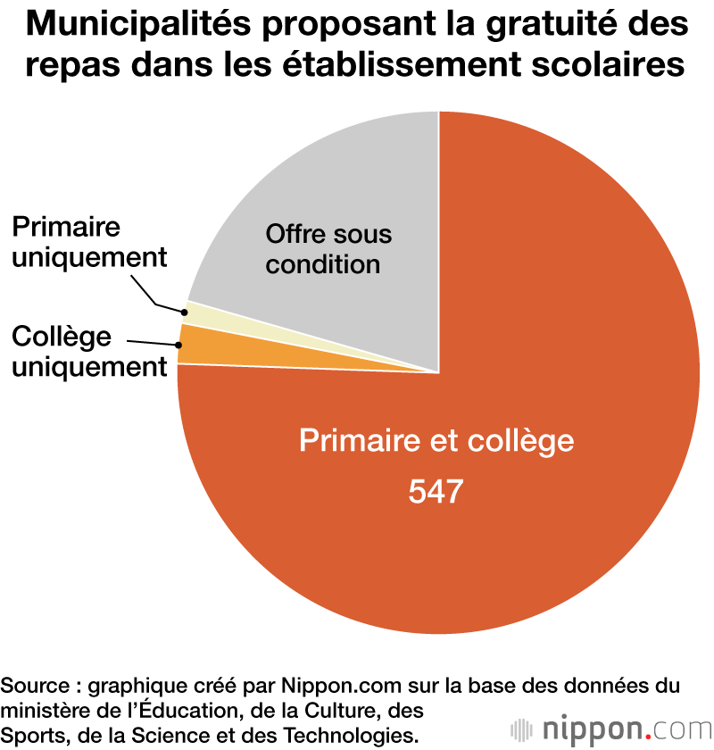 Selon le ministère de l’Éducation, de la Culture, des Sports, de la Science et des Technologies (MEXT), en date du 1er septembre 2023, les déjeuners étaient entièrement gratuits dans les établissements publics du primaire et du secondaire de 547 municipalités au Japon, soit près de 30 % des 1 794 municipalités sondées dans l’enquête gouvernementale. Un chiffre en nette augmentation, puisque cette offre est sept fois plus importante qu’en 2017, année du dernier rapport.