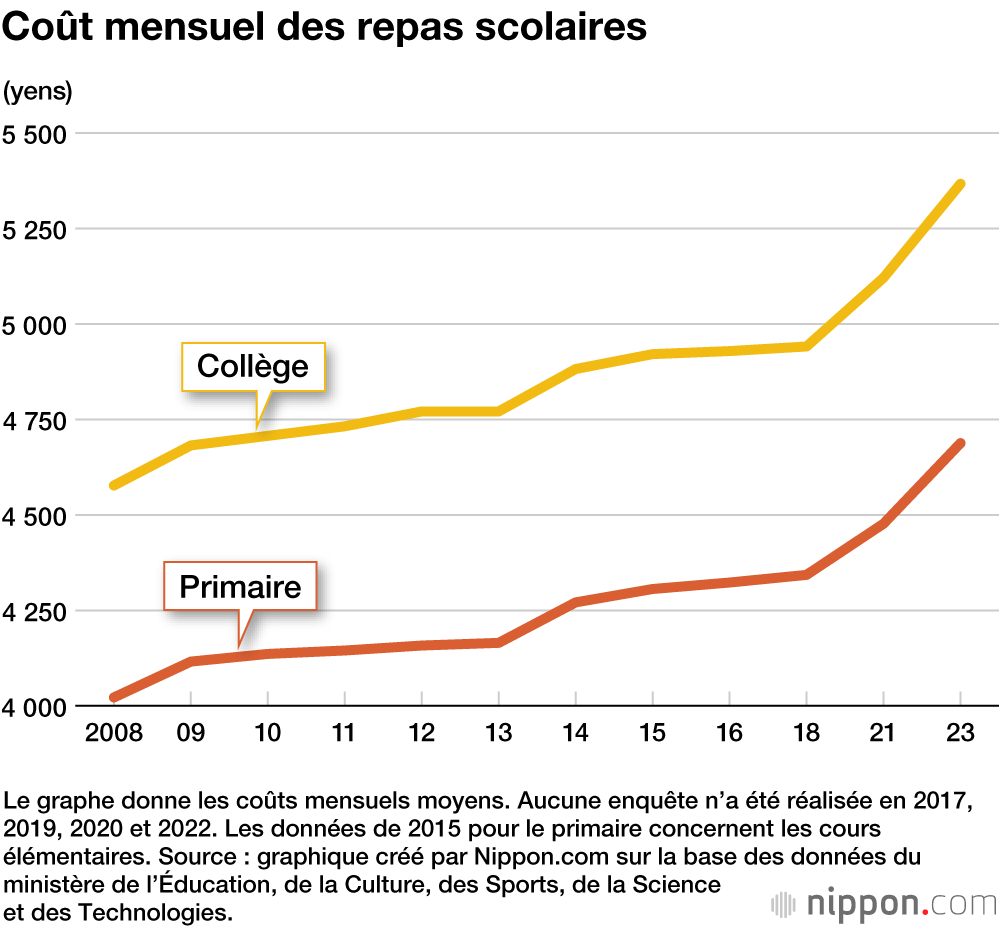 Or le coût moyen des repas scolaires (calculé en fonction du prix des ingrédients) est de 4 688 yens mensuels en primaire (environ 30 euros) et 5 367 yens en collège. Ces coûts ont augmenté d’environ 8 % sur les cinq dernières années et 12 % sur la décennie. Par préfecture, on constate qu’en primaire, les plus bas coûts sont pratiqués à Shiga (3 933 yens) et les tarifs les plus élevés sont à Fukushima (5 314 yens). De même, au collège, Shiga reste avec les plus bas coûts (4 493 yens) et on débourse le plus à Toyama (6 282 yens).