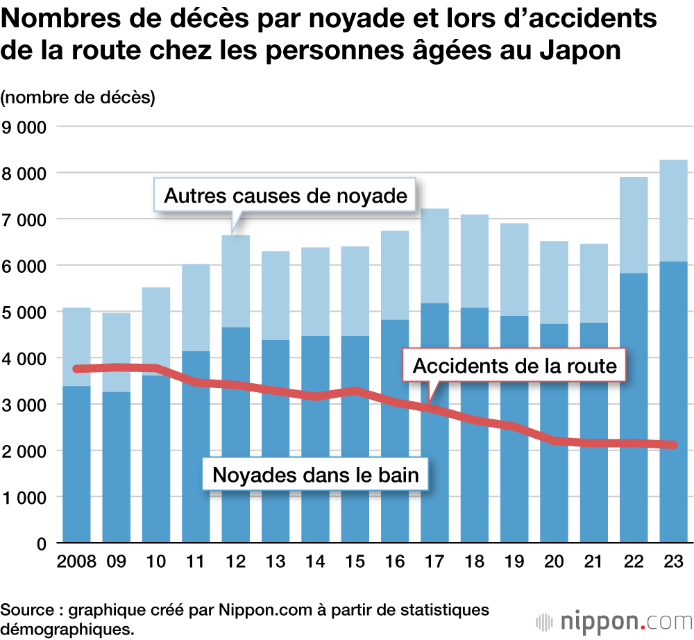 Avec une société japonaise de plus en plus grisonnante, le nombre de personnes âgées victimes d’hydrocution augmente progressivement. En revanche, le nombre de décès par accident de la route dans cette tranche d’âge a, lui, diminué grâce un renforcement des sanctions en cas de conduite dangereuse et aux progrès des technologies de sécurité préventive telles que les systèmes de freinage avec atténuation des chocs lors de collisions. Ainsi, en 2023, le nombre de personnes âgées qui se sont noyées dans un bain était près de trois fois supérieur à celui des morts sur la route.
