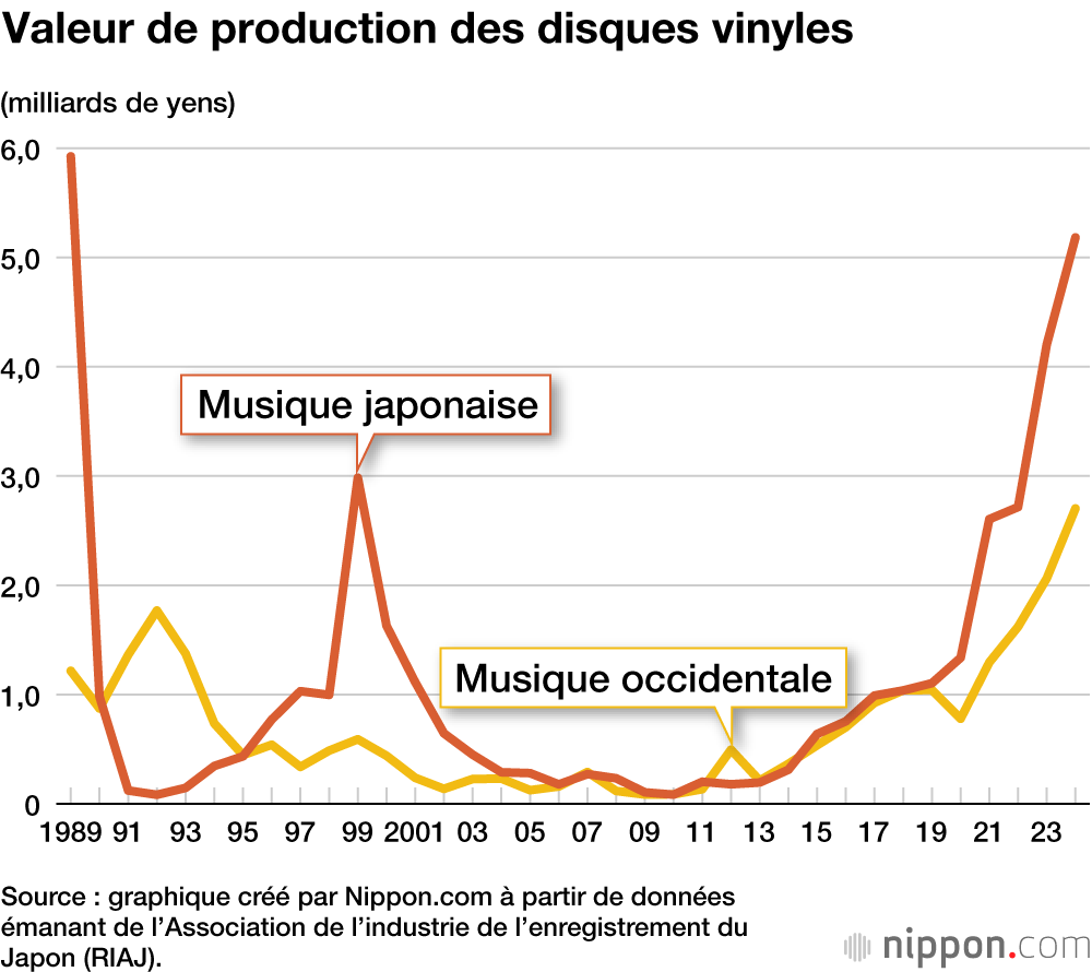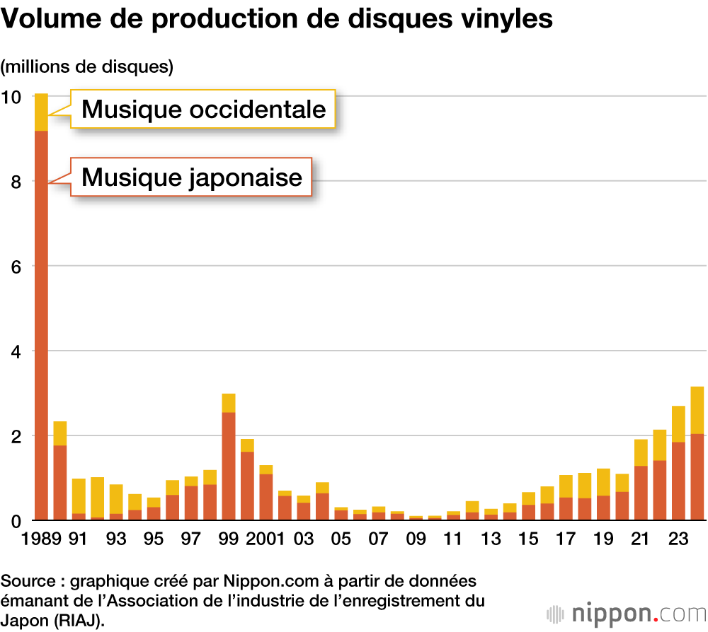 Selon l’Association de l’industrie de l’enregistrement du Japon (RIAJ), 3 149 000 disques vinyles, musiques japonaise et occidentale confondues, ont été produits au Japon en 2024, 17 % de plus que l’année précédente. La valeur de la production a elle aussi augmenté, plus 26 %, pour atteindre 7,9 milliards de yens (48 millions d’euros). C’est la première fois en 35 ans que cette valeur dépasse la barre des 7 milliards de yens.