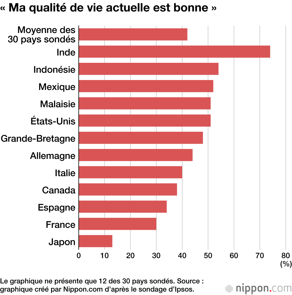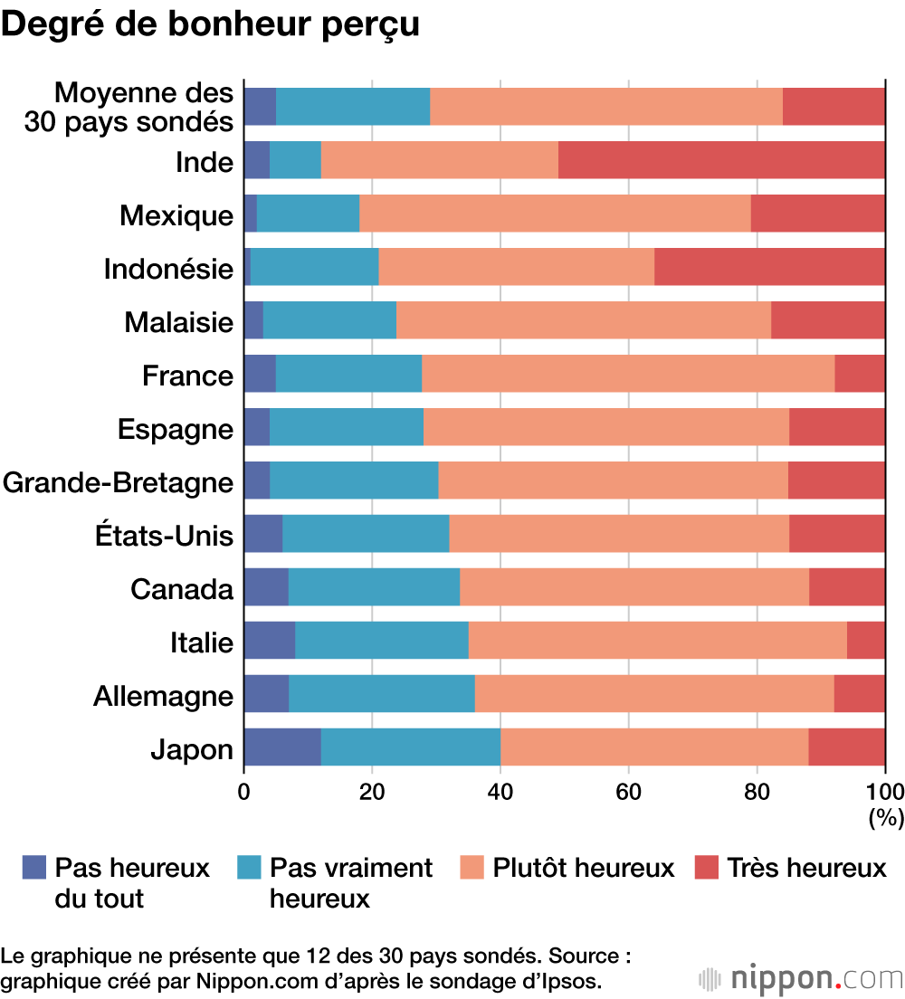 L’institut de sondage parisien Ipsos a mené une enquête sur le bonheur auprès de 23 765 personnes de 30 pays. Il en résulte que 60 % des répondants japonais se déclarent « heureux » (12 %« très heureux » et 48 % « plutôt heureux ».). L’Archipel se classe ainsi 27e sur 30. La première place revenant à l’Inde, avec 88 % d’habitants « heureux ». La moyenne est de 71 %.