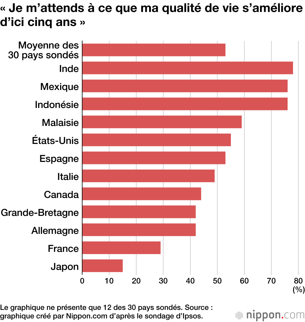 Le Japon termine dernier du classement en termes de pourcentage quand il s’agit d’affirmer que « ma qualité de vie actuelle est bonne », ainsi que « je m’attends à ce que ma qualité de vie s’améliore d’ici cinq ans ».