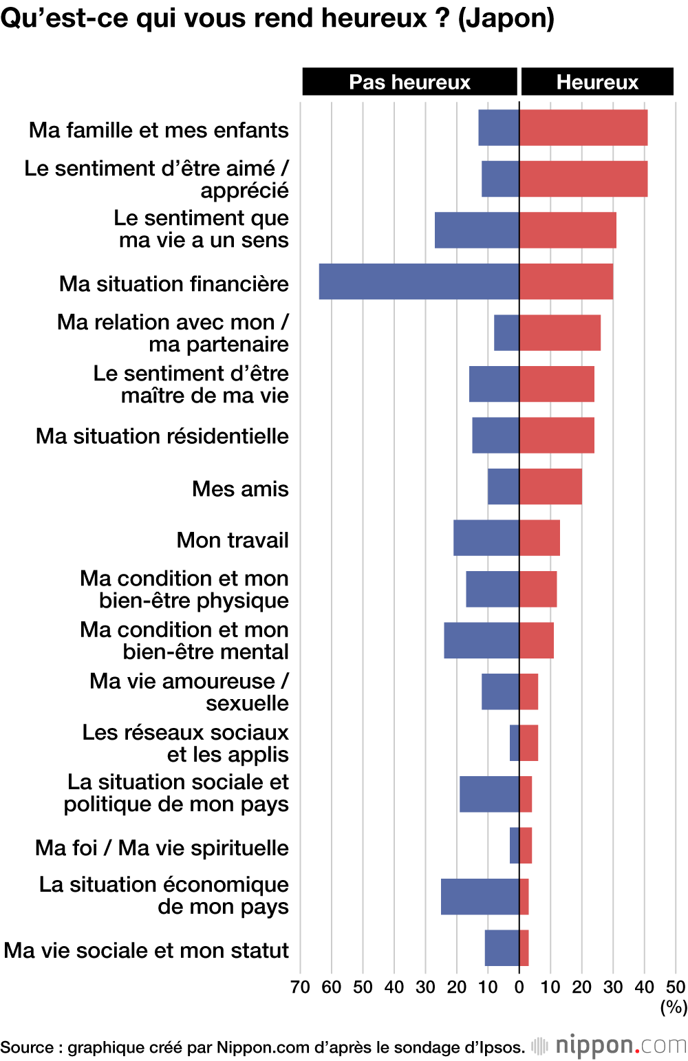 Concernant les Japonais qui notent qu’ils ne sont « pas heureux du tout », la raison la plus communément citée est la situation financière, à 64 %, soit plus du double du pourcentage portant sur la deuxième raison la plus citée, qui est « je sens que ma vie a un sens » (seuls 27 % des sondés le déclarent).
