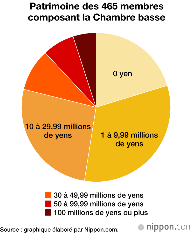 Plus de la moitié des 465 députés possédaient moins de 10 millions de yens de patrimoine (61 000 euros), avec environ 20 % déclarant en avoir aucun. Parmi ces derniers, Koizumi Shinjirô, le fils de l’ancien Premier ministre Koizumi Junichirô, mais aussi Katô Ayuko, la fille de l’ancien Secrétaire général du cabinet Katô Kôichi, ainsi que Kawamura Takashi, l’actuel chef du Parti conservateur du Japon.