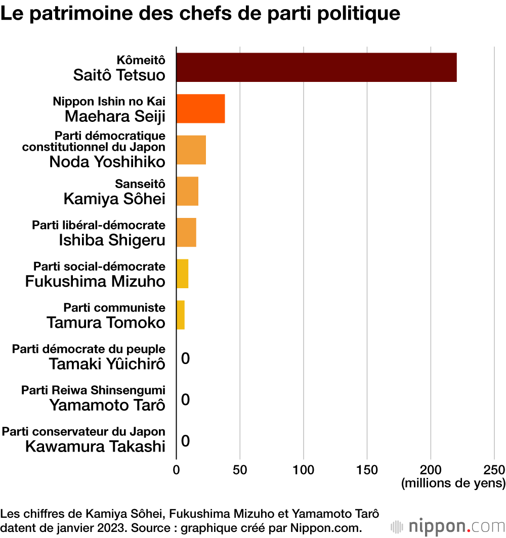 La personne possédant le patrimoine le plus important est l’ancien Premier ministre Aso Tarô, 84 ans, du Parti libéral-démocrate (PLD), avec 601,53 millions de yens (3,7 millions d’euros). Il est suivi de près par Aisawa Ichirô, également du PLD, avec 601,3 millions de yens. Au total, 22 députés, principalement issus du PLD, ont déclaré un patrimoine supérieur à 100 millions de yens. Saitô Tetsuo, le chef du parti Kômeitô, allié du pouvoir, possède un patrimoine à hauteur de 220,4 millions de yens, alors que celui du Premier ministre Ishiba Shigeru est de 15,6 millions de yens (96 000 euros), soit en dessous de la moyenne.