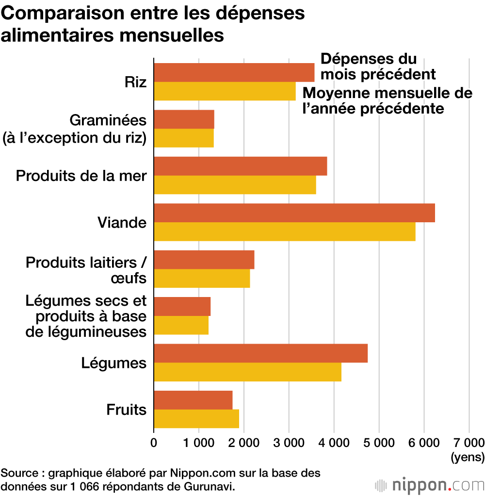 Le guide japonais en ligne de gastronomie et de restaurants Gurunavi a mené une enquête sur la consommation de nourriture à la mi-février auprès de ses utilisateurs. Les résultats ont montré que les dépenses mensuelles pour le riz, la viande et les légumes ont augmenté de plus de 400 yens par rapport àl’année précédente.