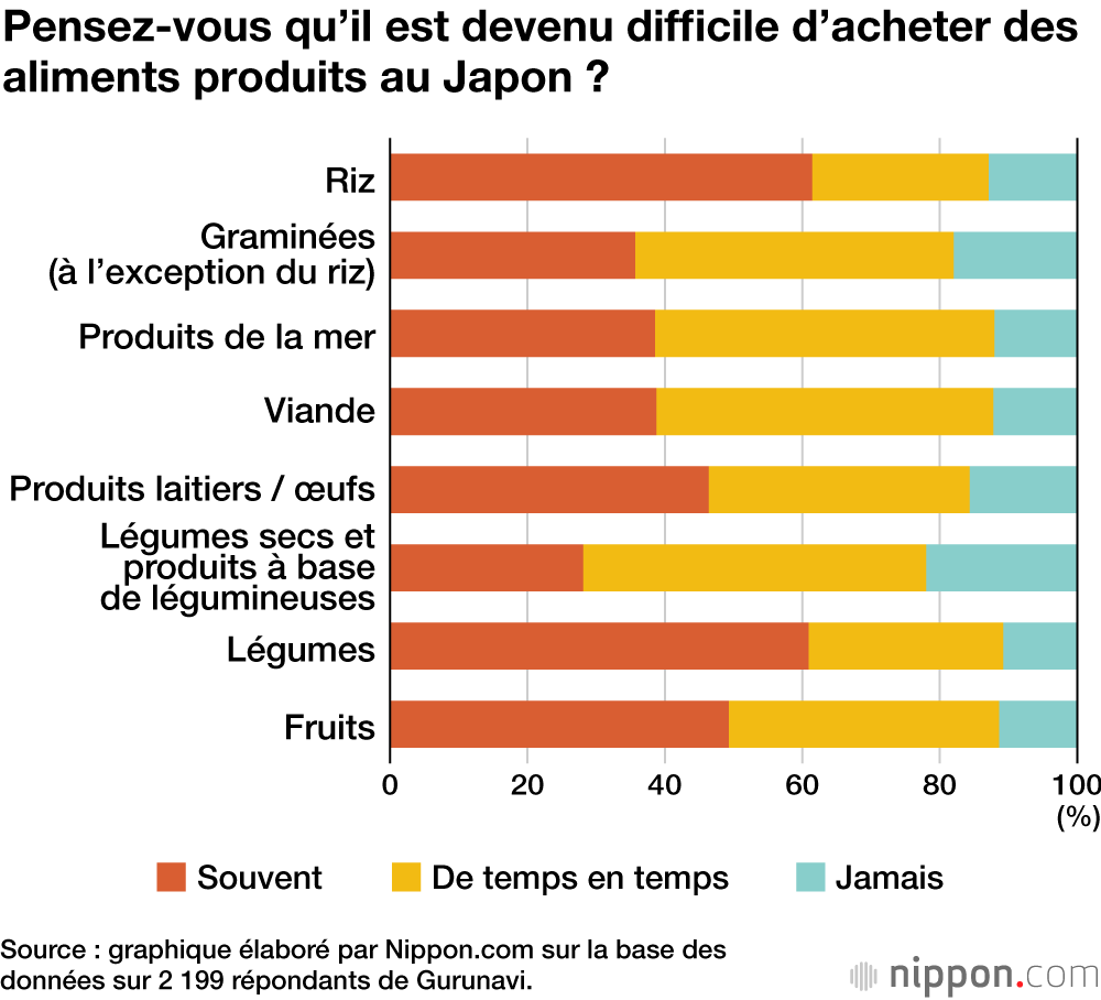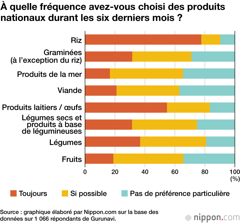 Concernant les préférences pour les aliments produits au Japon, le riz se démarque en particulier, avec 77,6 % des répondants déclarant qu’ils achetaient toujours du riz produit nationalement, le pourcentage allant jusqu’à près de 90 % en incluant ceux qui en achetaient lorsque c’était possible. Plus de la moitié des personnes interrogées ont également répondu qu’elles achetaient toujours des produits laitiers et des œufs produits au Japon. Pour les produits de la mer, la viande et les fruits, environ 30 % des répondants ont déclaré qu’ils n’insistaient pas particulièrement sur l’achat de produits nationaux mais 40 % ont dit qu’ils en achetaient lorsque cela était possible.