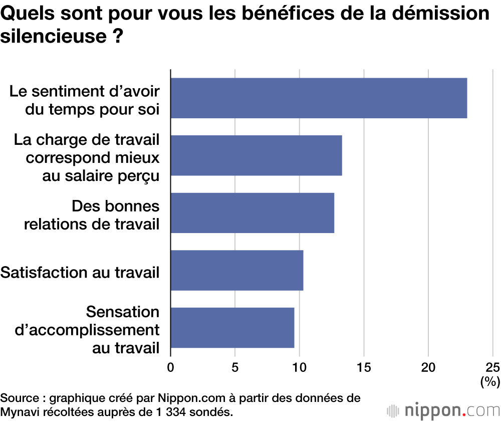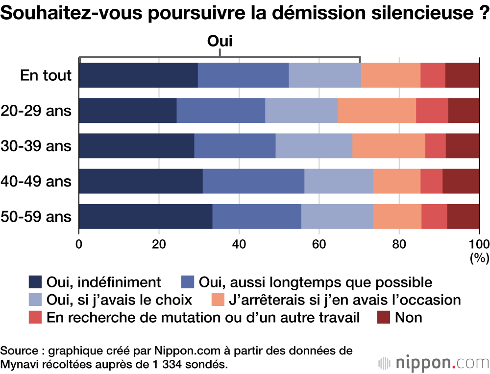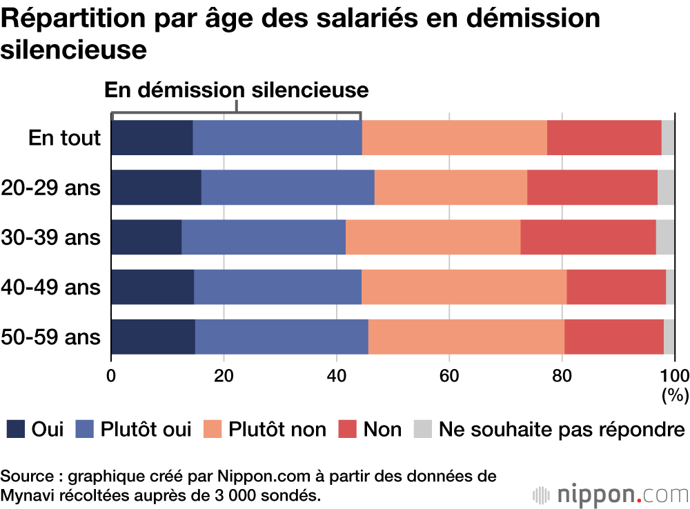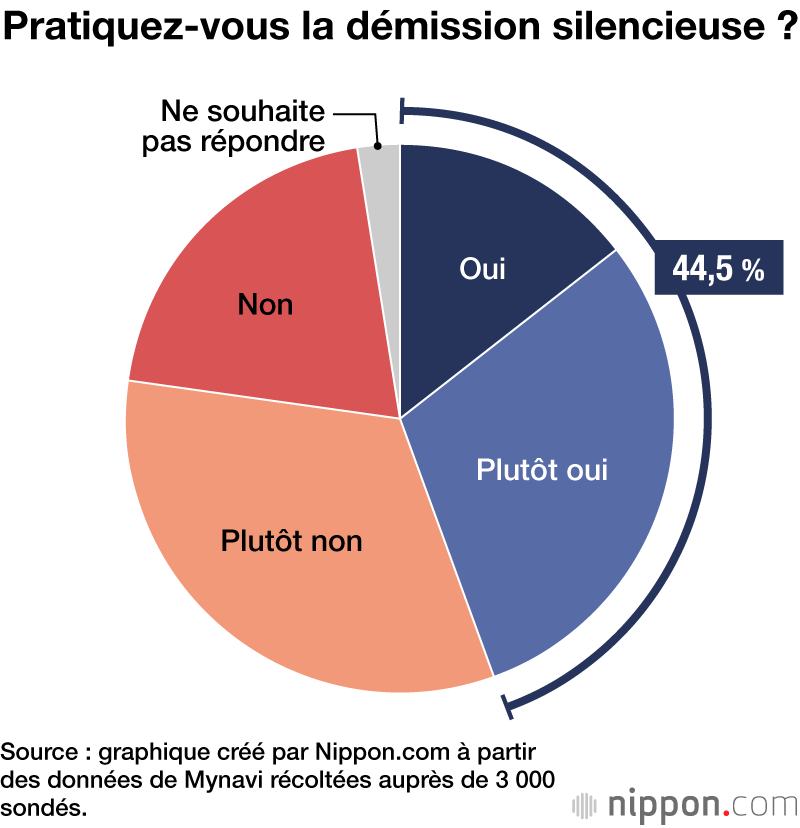 Un sondage récent révèle que 44,5 % des salariés japonais pratiquent ce qu’on appelle désormais la « démission silencieuse » (shizukana taishoku), c’est-à-dire qu’ils se contentent strictement d’exécuter les tâches qui leur sont assignées, sans chercher à faire plus que ce qu’on leur demande, ni à progresser dans leur carrière.