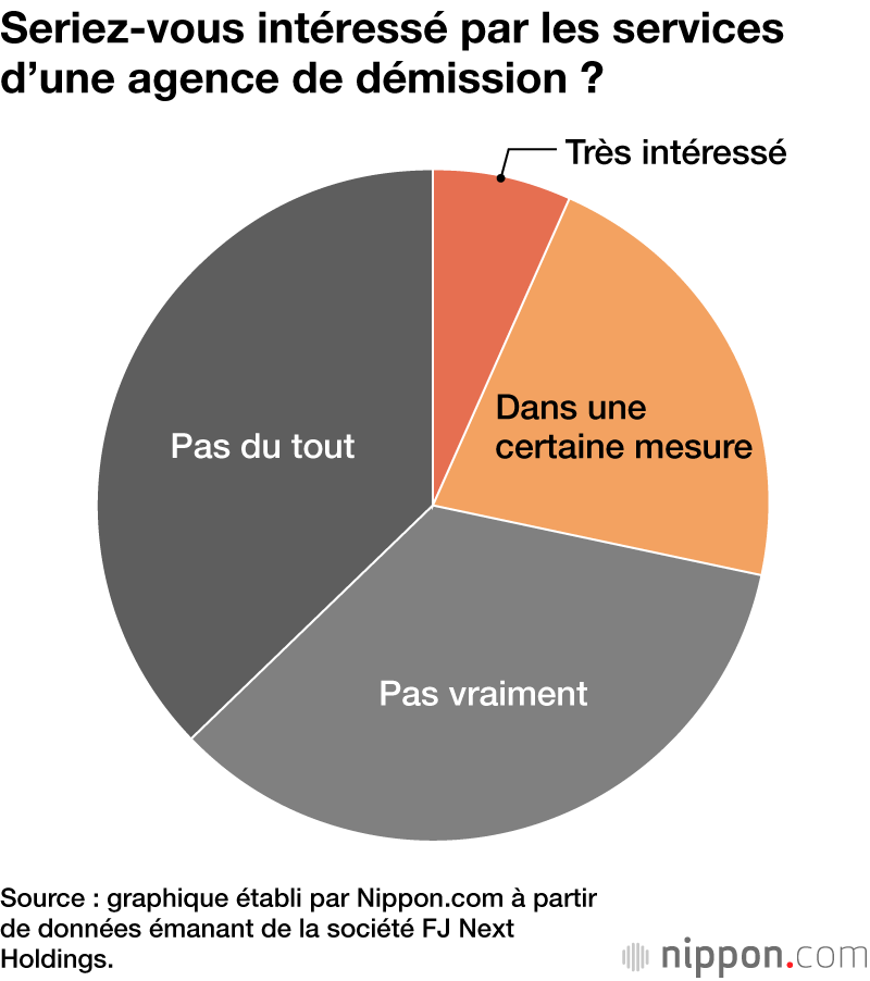 En février 2025, la société immobilière FJ Next Holdings, basée à Tokyo, a mené une étude en ligne auprès de 400 employés d’entreprise âgés entre 20 et 39 ans, vivant seuls dans l’agglomération de Tokyo (préfectures de Tokyo, Saitama, Chiba et Kanagawa). Ils ont notamment été interrogés sur leur intérêt pour les agences de démission, lesquelles prennent en charge les procédures liées à l’arrêt d’une période d’emploi, sur décision de l’employé de l’entreprise lui-même. Les services de ces agences permettraient d’éviter certains problèmes.