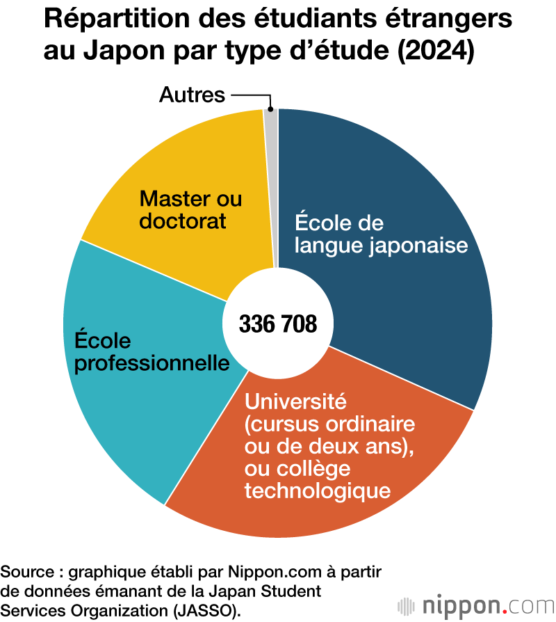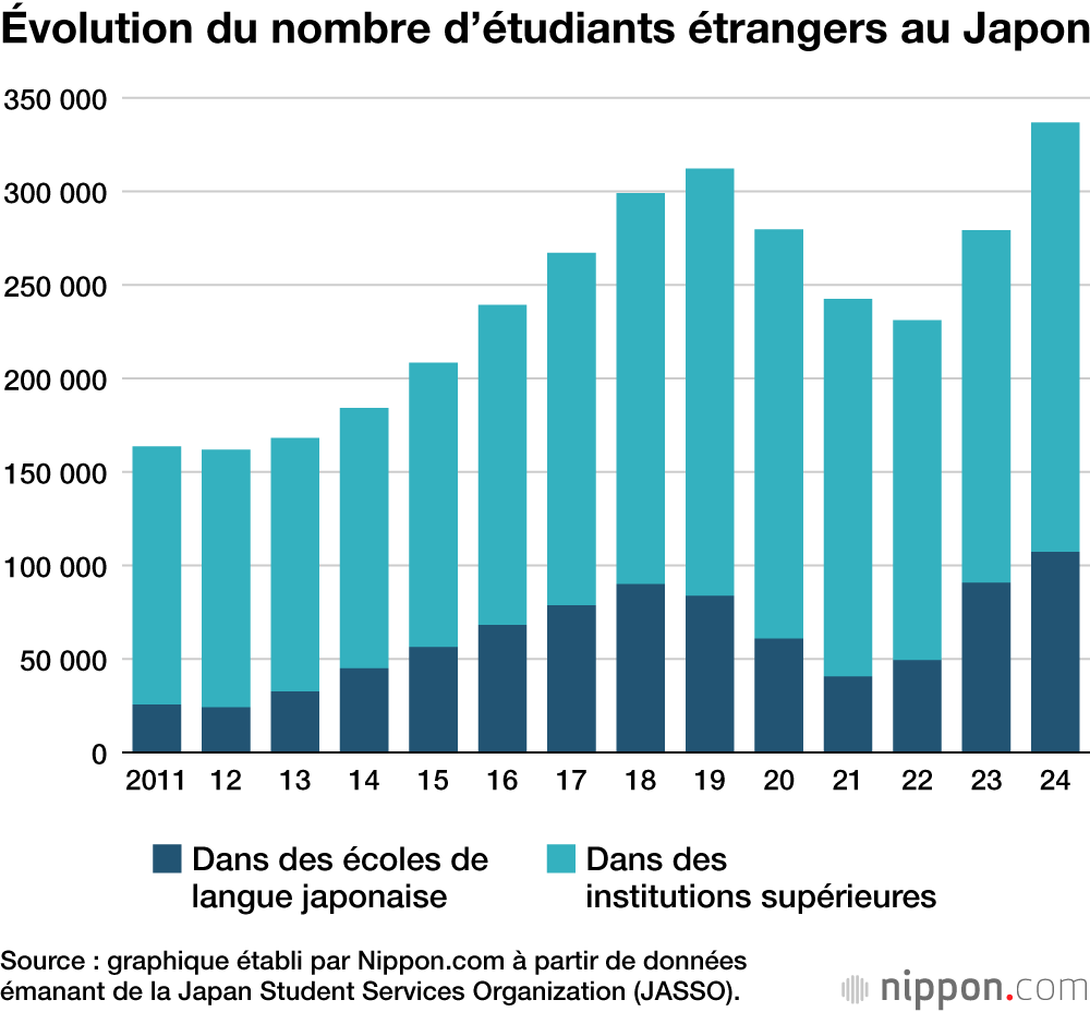 Selon une étude réalisée par la Japan Student Services Organization (JASSO), une agence administrative indépendante, en date du 1er mai 2024, le Japon accueillait 336 708 étudiants étrangers, soit 21 % de plus que l’année précédente. Ce chiffre était supérieur à celui enregistré en 2019, avant la pandémie de coronavirus, établissant un nouveau record. La faiblesse du yen notamment pourrait expliquer cette augmentation.