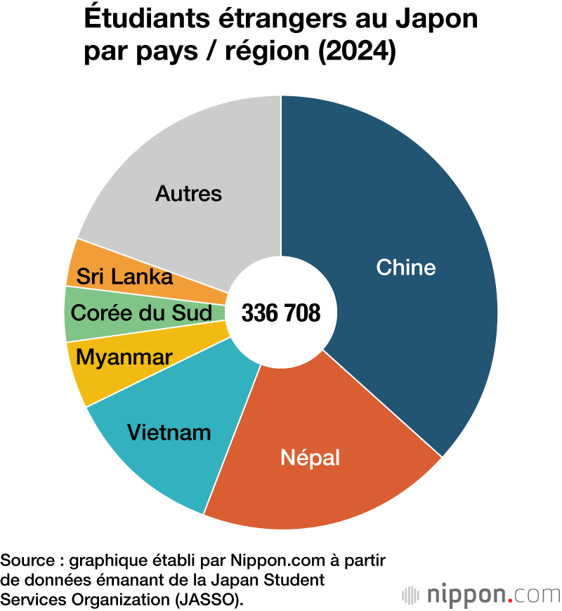 Les étudiants chinois étaient de loin les plus nombreux, représentant 36,7 % du total, soit 123 485 étudiants. Ensuite, venaient les étudiants originaires du Népal, avec 19,2 % (64 816), du Vietnam, avec 12 % (40 323), du Myanmar, avec 4,9 % (16 596), de la Corée du Sud, avec 4,3 % (14 579), du Sri Lanka, avec 3,6 % (12 269) et de Taïwan, avec 2,3 % (7 655). À noter que le nombre d’étudiants népalais a augmenté de plus de 26 000 par rapport à l’année précédente.