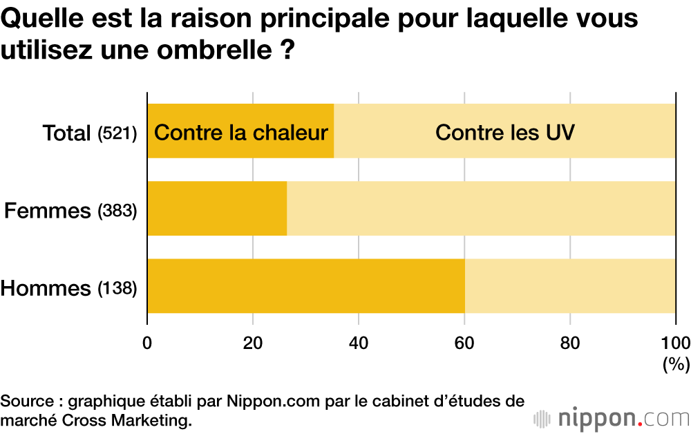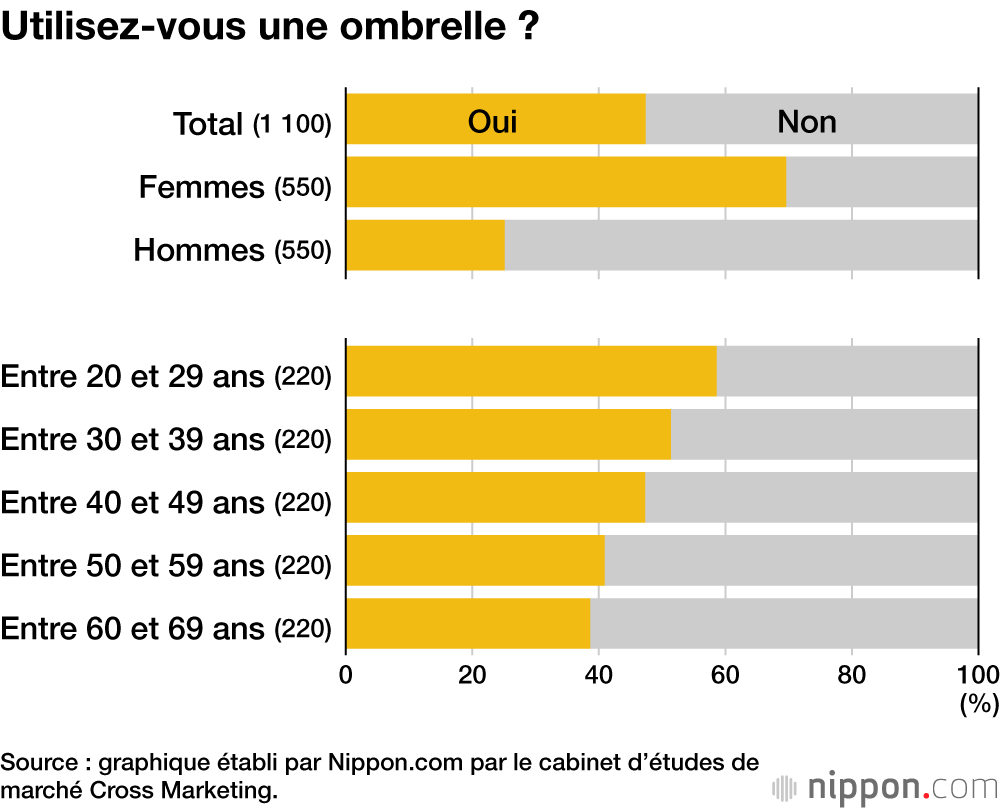 Selon une étude récente, au Japon, 47,4 % des personnes interrogées utilisent une ombrelle. Si cet objet rencontre nettement plus de succès auprès des femmes, un homme sur quatre (25,1 %), a également confié en utiliser une. Les jeunes dans la vingtaine arrivent largement en tête, avec près de 60 %, contre moins de 40 % chez les sexagénaires. Cette étude a été menée par le cabinet d’études de marché Cross Marketing, auprès de 1 100 personnes âgées entre 20 et 69 ans.