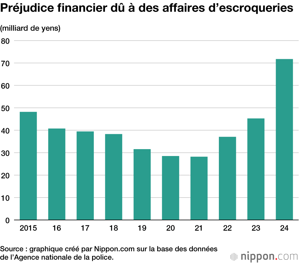 Les escrocs se frottent les mains. Avec 58,6 % d’affaires supplémentaires et 71,8 milliards de yens extorqués (430 millions d’euros), soit 26,5 milliards de yens de plus qu’en 2023, les statistiques de l’Agence nationale de la police montrent que le préjudice financier lié à la « fraude spécialisée » au Japon a plus que doublé en 2024. L’année dernière, le Japon a recensé 21 043 escroqueries (2 005 de plus qu’en 2023).