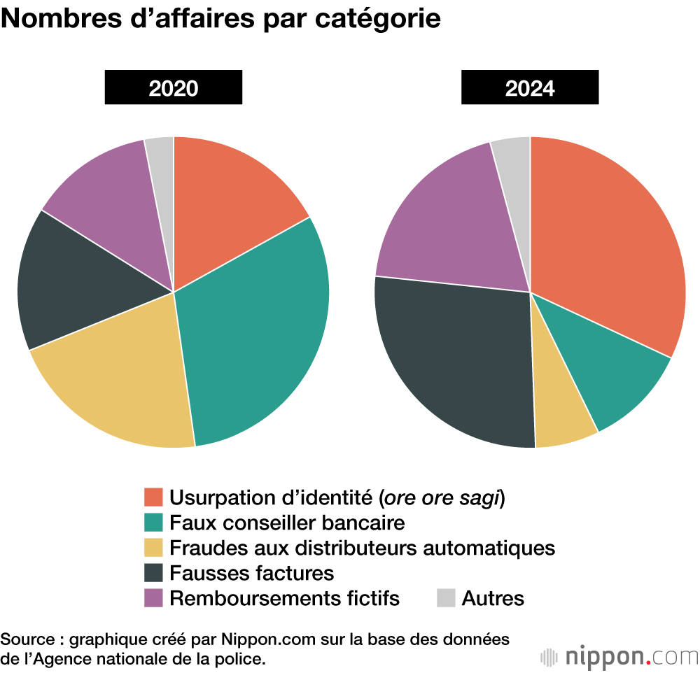 Chaque jour les préjudices se chiffrent à 196 millions de yens (1,16 million d’euros), soit 72,1 millions de yens de plus qu’en 2023, et le montant moyen extorqué a augmenté de 1,1 million de yens pour atteindre les 3,5 millions de yens par affaire (21 000 euros).