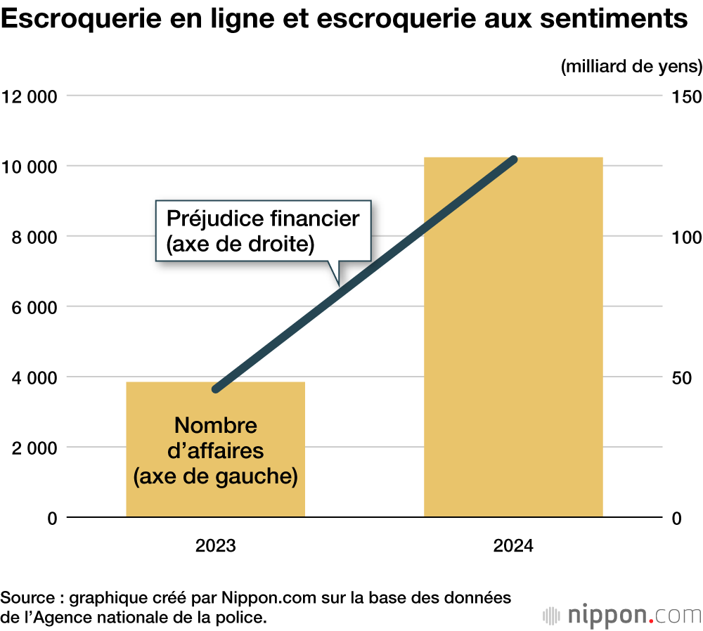L’escroquerie en ligne consiste à utiliser des photos truquées de personnes célèbres pour soutirer de l’argent vers de faux projets et l’escroquerie aux sentiments sévit sur les réseaux sociaux et les applications de rencontre. Ces deux catégories ont connu une forte augmentation en 2024, le nombre d’affaires (10 237) a plus que doublé avec un préjudice financier qui a presque triplé pour se chiffrer à 127,2 milliards de yens. Mais au Japon, l’Agence nationale de la police traite à part l’escroquerie en ligne à long terme qui n’est pas classée en « fraude spécialisée ».