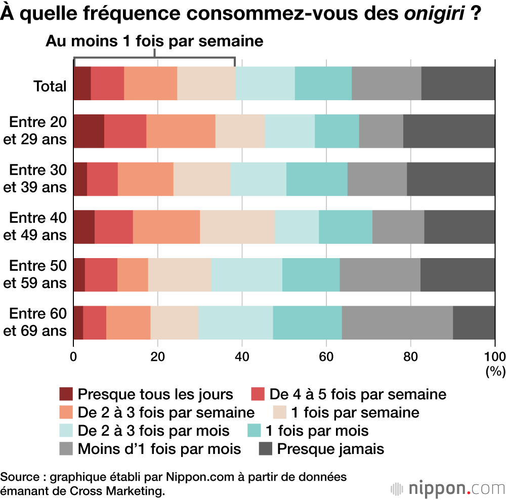 Selon une étude au Japon, 38,5 % des personnes interrogées consomment ces petites boules de riz « au moins une fois par semaine ». Par tranche d’âge, ce pourcentage s’élève à 45,5 % chez les personnes dans la vingtaine et à 47,7 % dans la quarantaine. Plus de 60 %, tous âges confondus, ont déclaré consommer des onigiri « au moins une fois par mois ». Cette étude a été menée par Cross Marketing, auprès de 1 100 personnes âgées entre 20 et 69 ans.