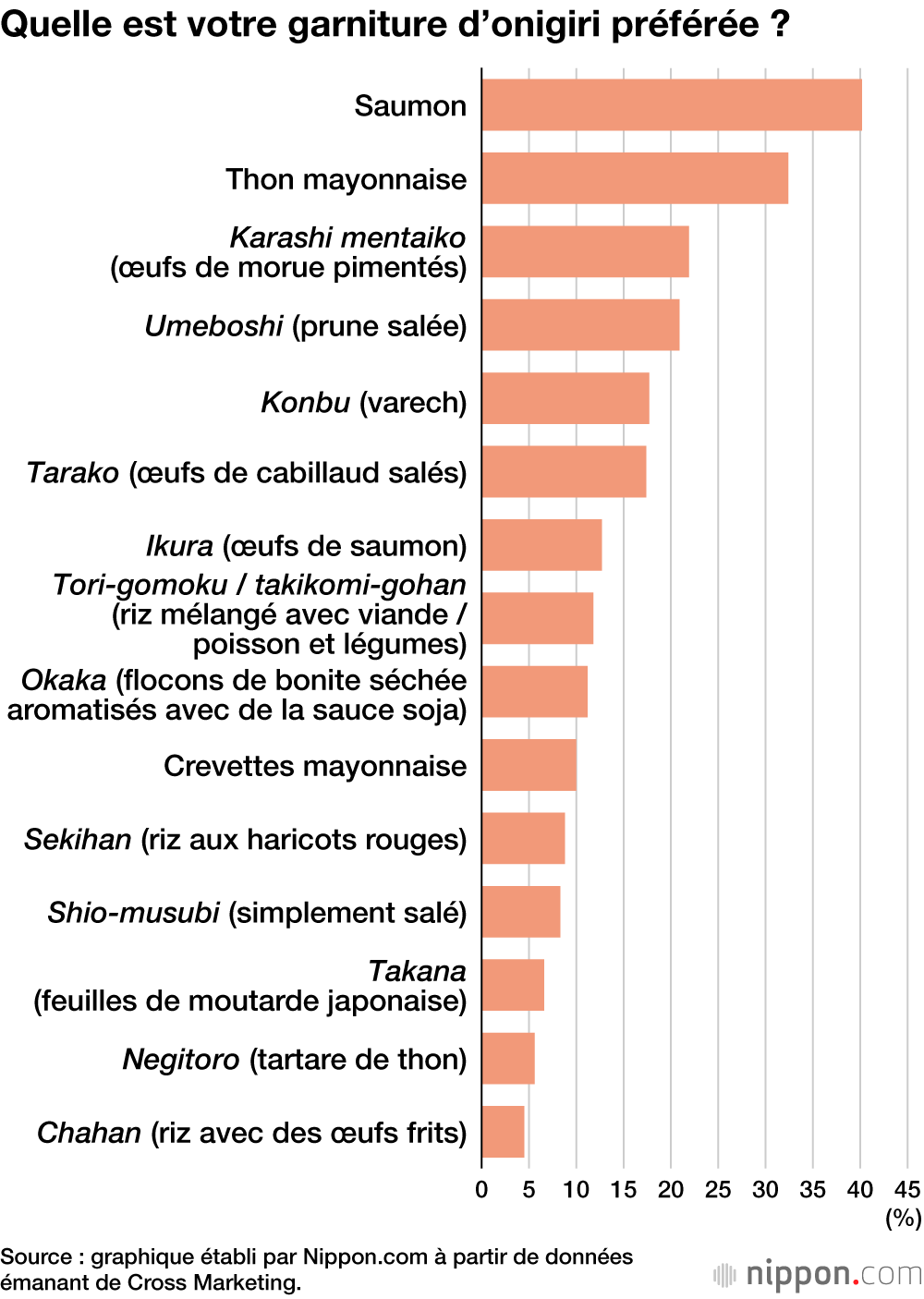 C’est sans appel : la garniture préférée des Japonais est le saumon (40,2 %). Venaient ensuite le thon mayonnaise (32.4 %), les œufs de morue pimentés karashi mentaiko (21.9%) et la prune salée umeboshi. Si les quinquagénaires et les sexagénaires ont confié avoir une préférence pour le saumon, les quadragénaires, eux, ont dit être de grands amateurs de thon mayonnaise.