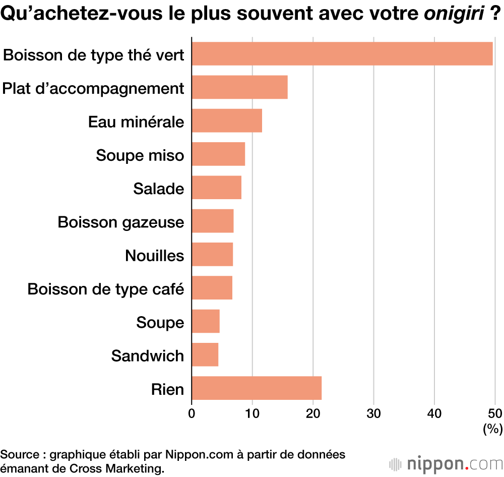 58,6 % des personnes interrogées ont confié acheter des onigiri dans des supérettes (konbini), avec une « boisson de type thé vert » pour 49,9 % d’entre elles.