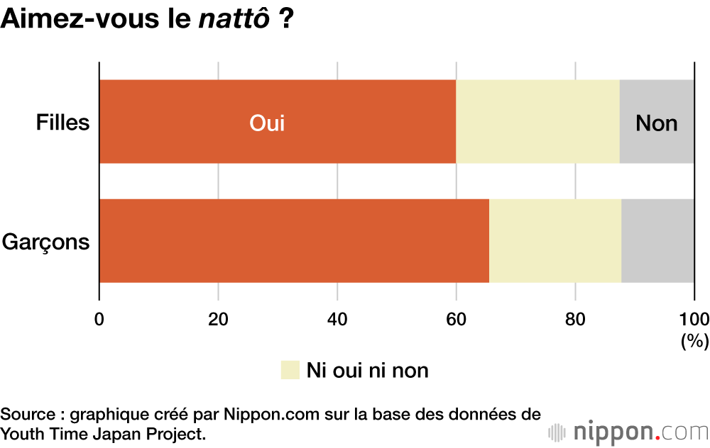 Un sondage mené en mai 2025 auprès de lycéens japonais a montré que le nattô (soja fermenté) était apprécié par 65,5 % des garçons et 59,9 % des filles.