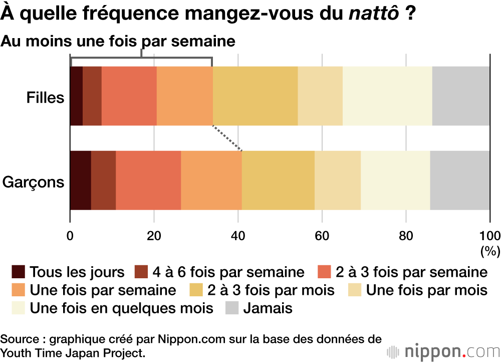 Il semble que les garçons consomment davantage de nattô que les filles, avec respectivement 40,9 % contre 33,9 %.