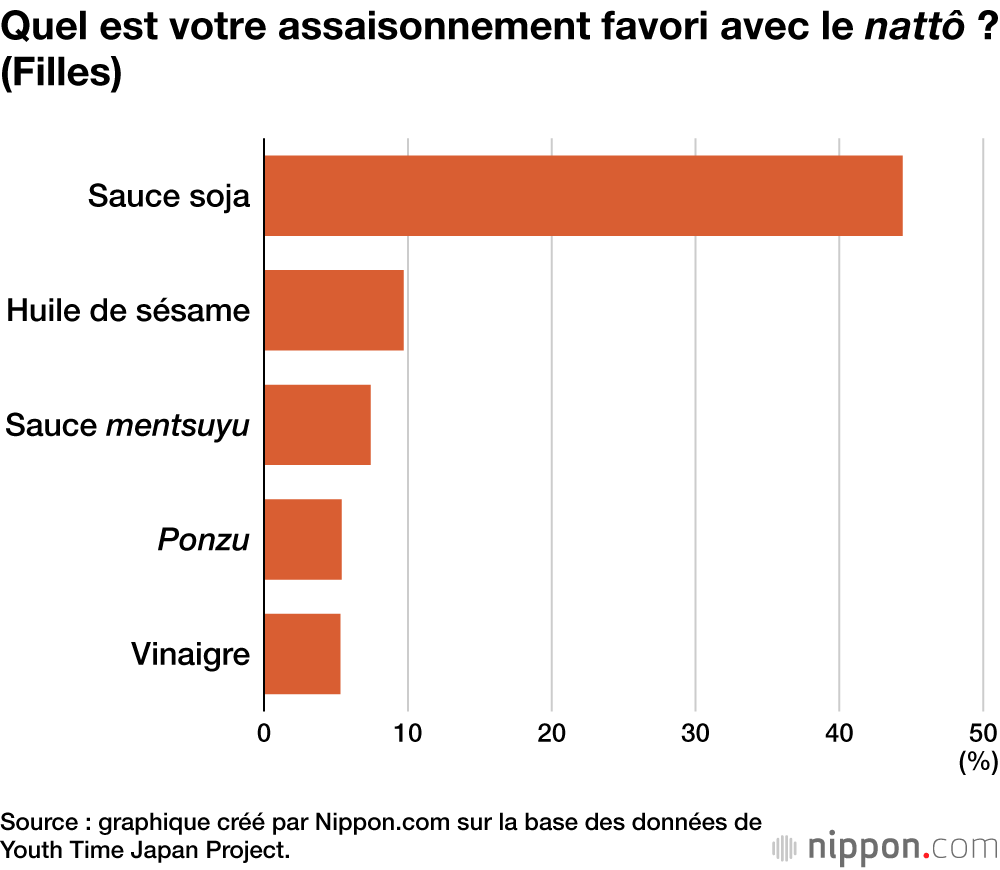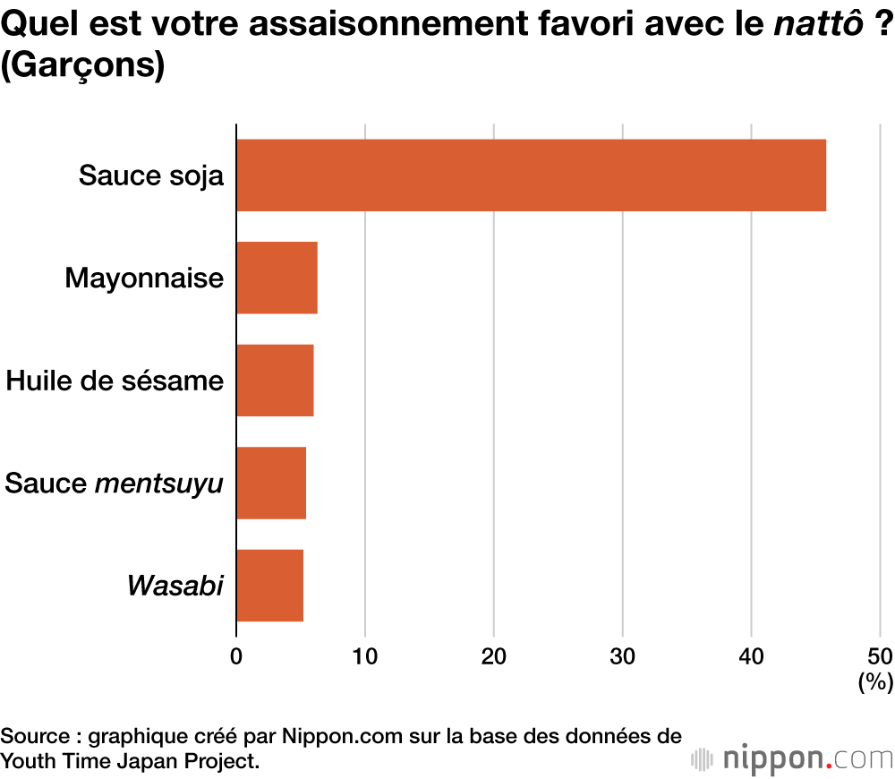 En leur demandant quel type d’assaisonnement ils utilisaient pour consommer le nattô (hormis la moutarde karashi et la sauce sucrée tare fournis avec le produit à l’achat), la sauce soja arrivait en tête pour les garçons comme les filles (environ 45 %).