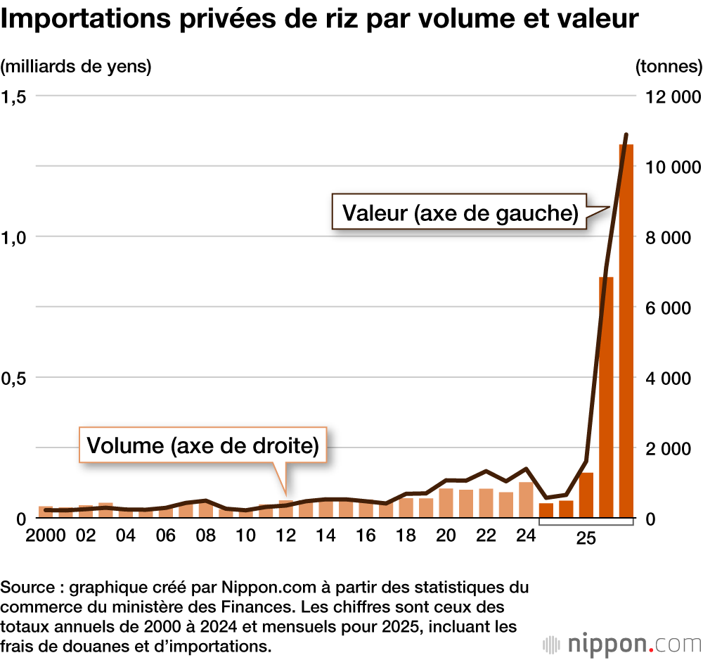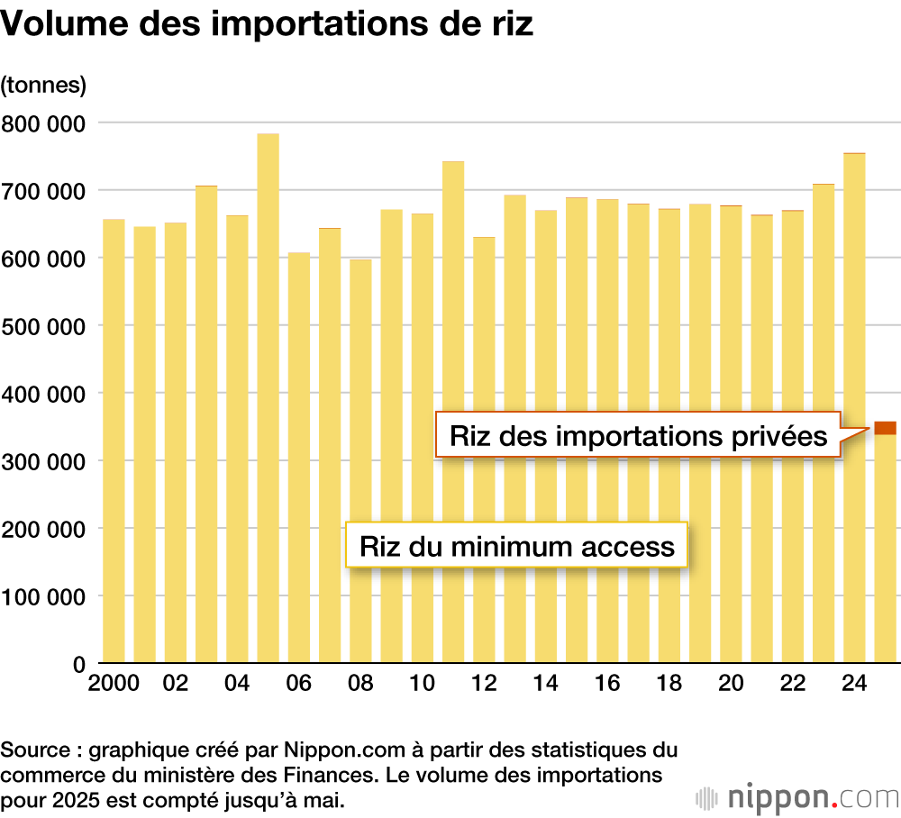 Lorsque des entreprises privées importent du riz, elles sont soumises à un droit de douane élevé de 341 yens par kilogramme. Ces dernières années, les importations privées sont restées dans une fourchette de 600 à 800 tonnes par an. Le graphique ci-dessous montre les volumes d’importation de riz, le jaune représentant le riz sous quota minimum access, et le rouge les importations privées, qui jusqu’en 2024 étaient si faibles qu’elles étaient pratiquement invisibles.