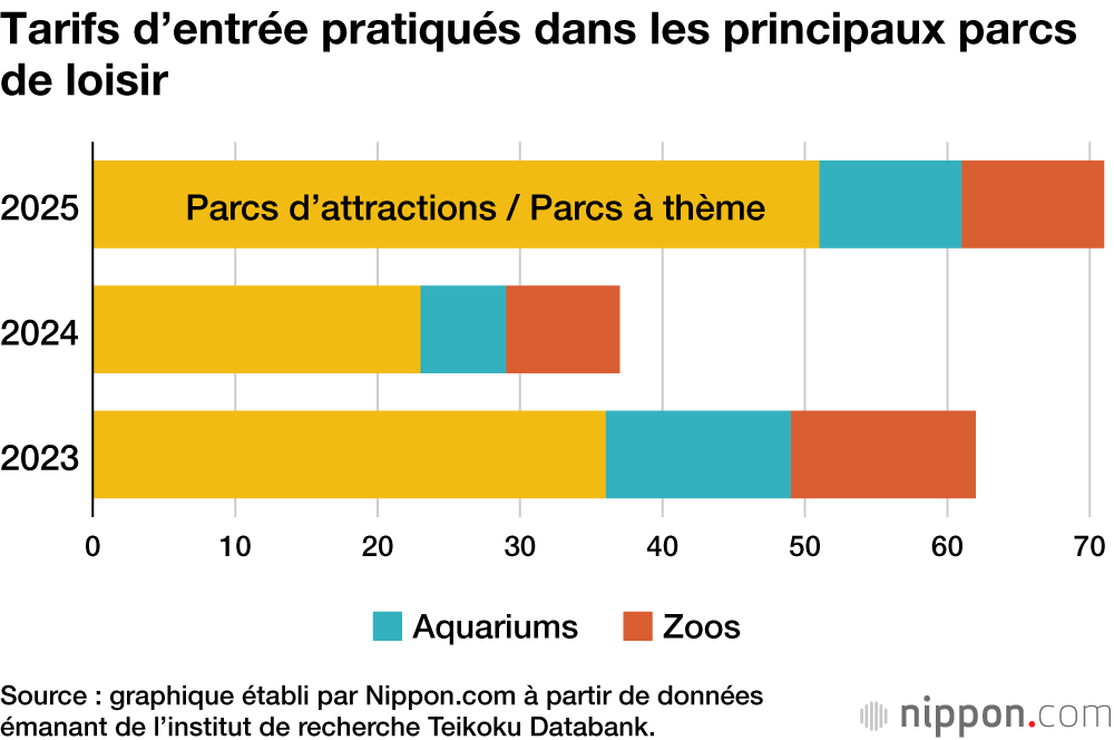 Selon une étude menée par l’institut de recherche Teikoku Databank, 71 des 190 parcs de loisirs majeurs, soit 37,4 % d’entre eux, ont revu à la hausse leurs tarifs d’entrée. Il s’agit notamment des parcs d’attractions, des parcs à thème, des aquariums et des zoos. Près de deux fois plus d’installations ont augmenté leurs prix par rapport à 2024. À noter que 51 des 100 parcs d’attractions et à thème que compte l’Archipel ont ainsi revu à la hausse la carte de leurs prix.