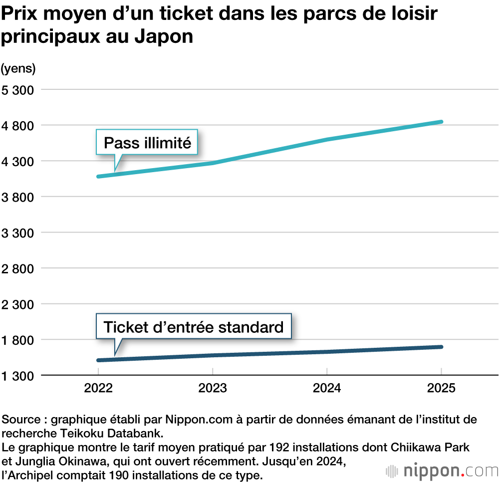 En 2025, le tarif d’entrée moyen pratiqué dans les parcs de loisir a augmenté de 4,2 % par rapport à l’année précédente, pour se situer à 1 695 yens (environ euros). Le prix moyen du pass illimité généralement proposé dans les parcs d’attractions ou à thème, qui comprend à la fois l’entrée et un accès illimité aux attractions, a, lui, augmenté de 5,4 %, pour s’élever à 4 846 yens (environ 28 euros).